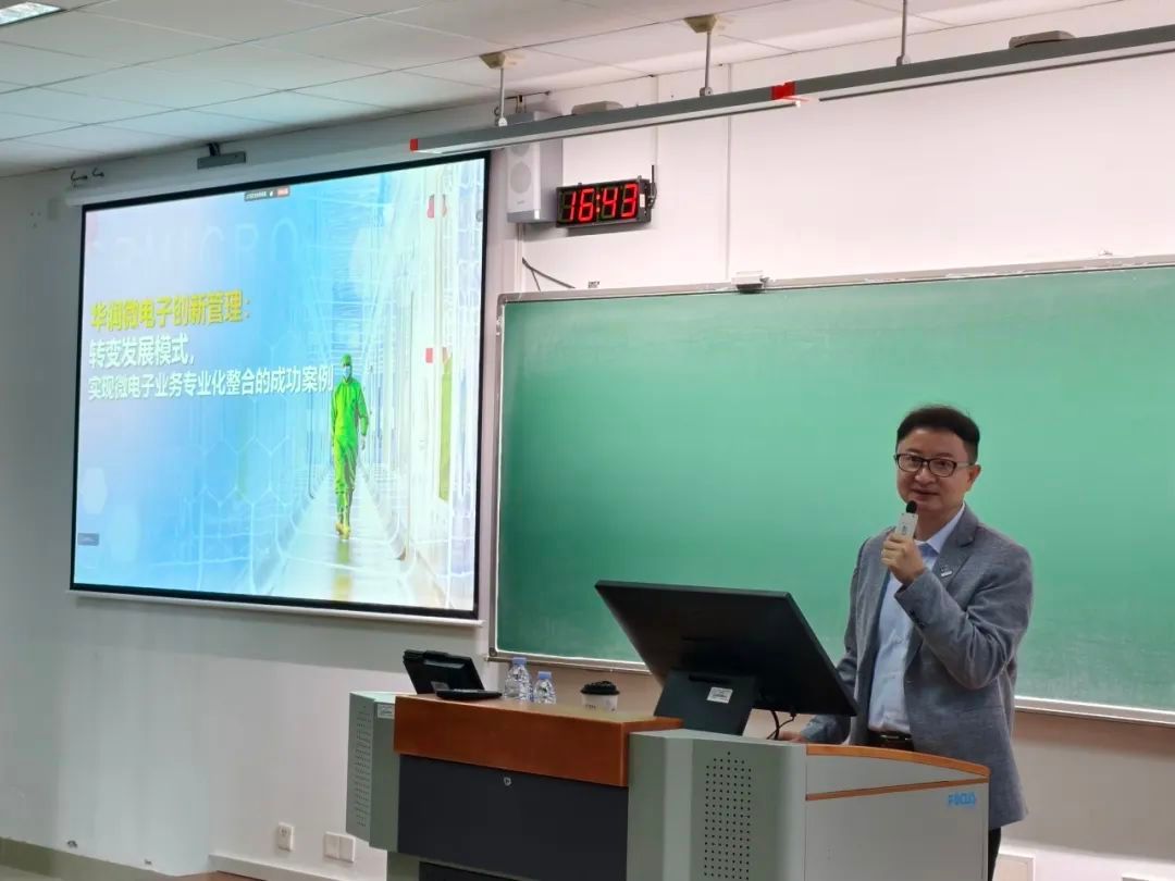 在学校的大力支持下,由电子学院牵头开设,面向全校各学院学生的宝藏工科通识课《芯片世界中的创新启蒙》第三轮课程本学期在翔安校区陆续开讲。3月12日,华润微电子总裁李虹先生作为主讲嘉宾,以“华润微电子创新管理:转变发展模式,实现微电子业务专业化整合的成功案例”为题,为同学们分享了半导体行业的管理经验与创新实践。学院党委书记石慧霞,院长陈忠,教师代表吕杭炳、李琳到场听课,学院副院长李澄主持课堂。