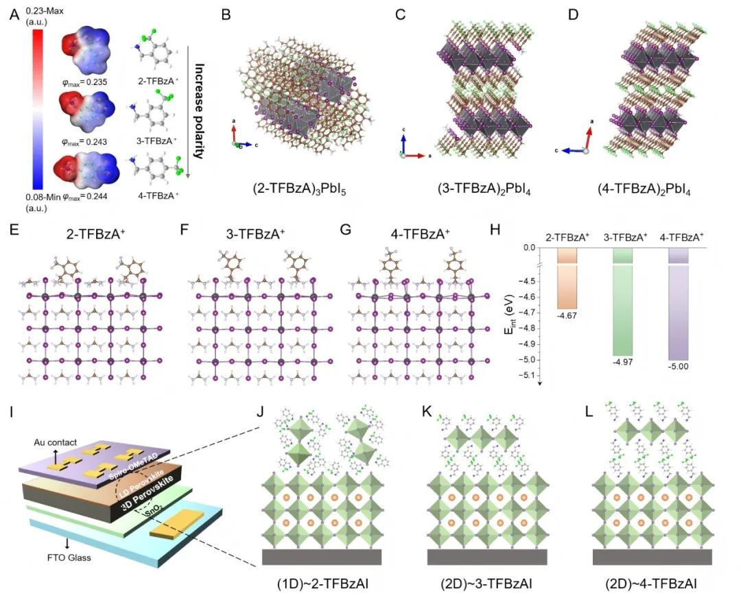 研究表明,低维钙钛矿(1D与2D)通过在3D钙钛矿表面形成的自组装结构,显著提升了界面电荷传输效率和缺陷钝化能力。然而,长期以来,低维钙钛矿的形成机制及其对器件性能的具体影响仍存争议。本研究通过调控三氟甲基(-CF3)基团在苯环上的不同取代位置,精确调控低维钙钛矿的维度和结构。团队发现,不同异构体配体的静电势分布和空间位阻效应,决定了低维钙钛矿的晶体维度与取向特性。其中,1D结构因其优异的通道取向和能级匹配能力,能够显著促进电荷转移,实现了器件性能的优化。