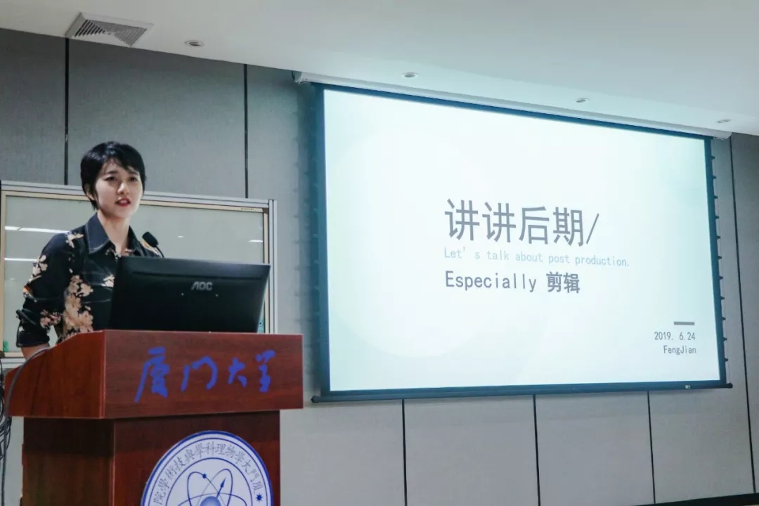 之后,赵凯璇进行了视频后期剪辑的培训。她认为,后期人员应当参与前期工作,以获得更好的视频素材。她讲述了视频的分类、剧组的组成,讲解了剪辑容易上手的pr基本操作,讲出了剪辑的基本逻辑和基本原则。授课过程中,以厦大盒子的视频为例,形象而富有说服力,让同学们收获良多。