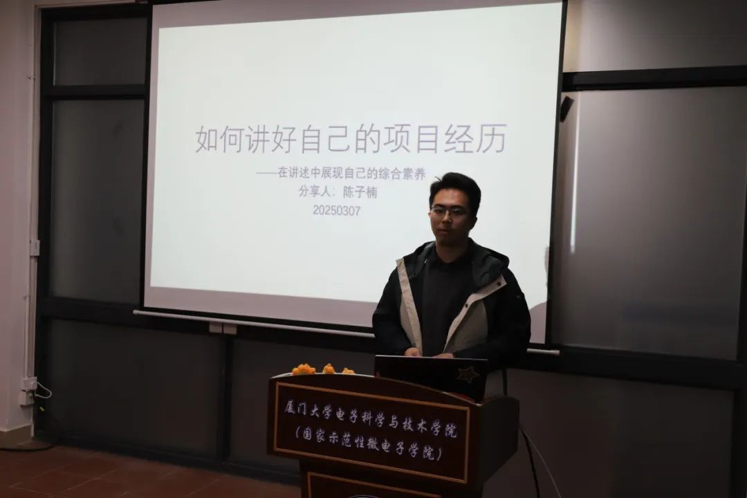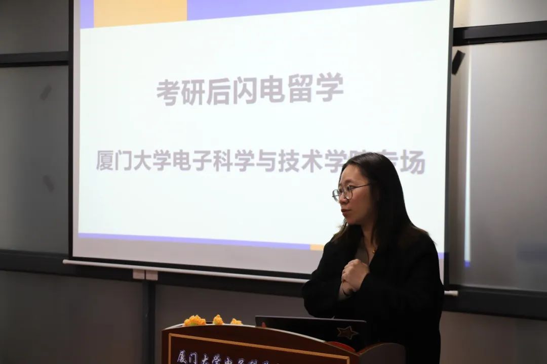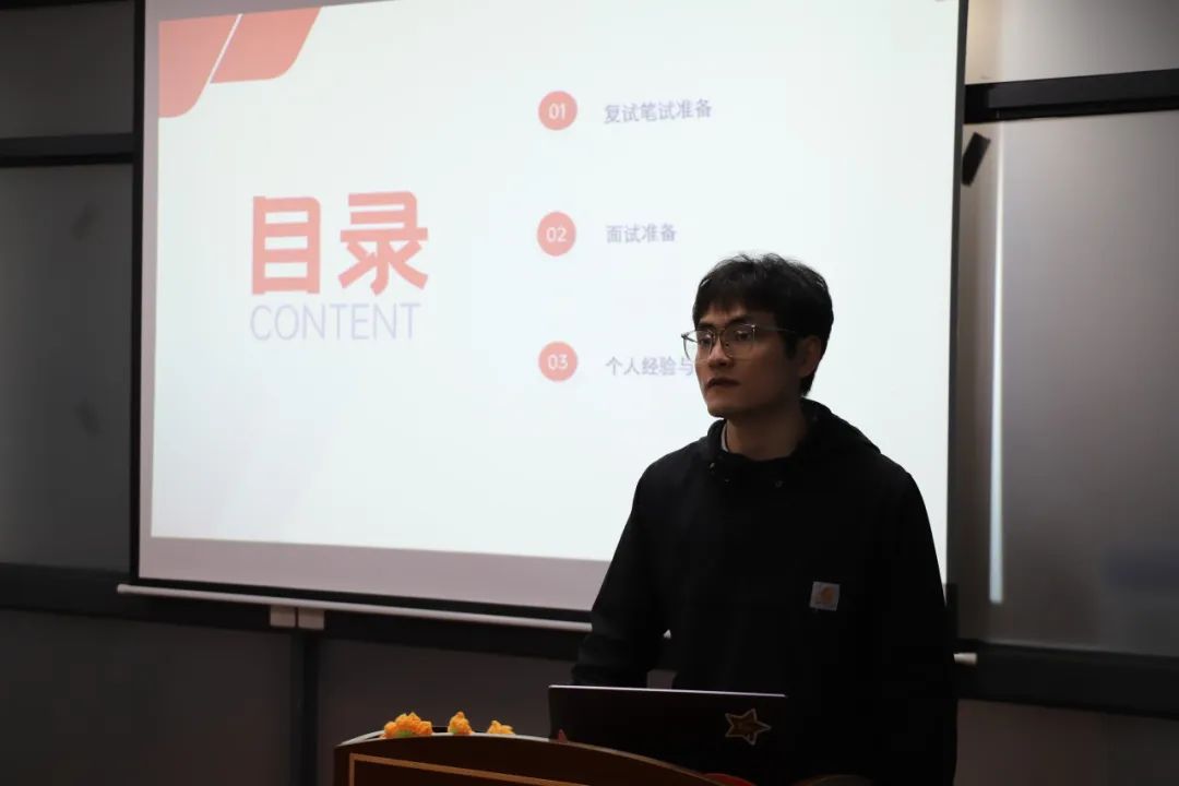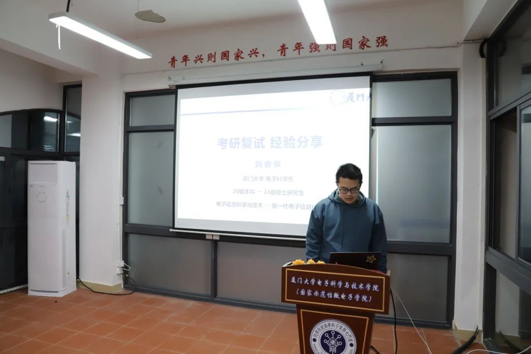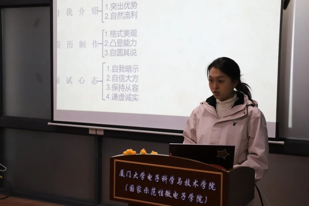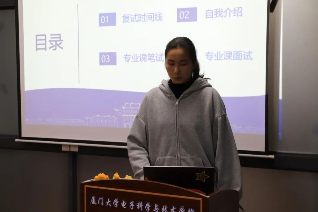 电子工程系徐菲向同学们介绍了复试的准备流程,并分享了自己的心路历程,包括专业课资料收集、自我介绍及简历制作要点,以及面试心态调整的技巧,鼓励大家自信大胆地展示自己。