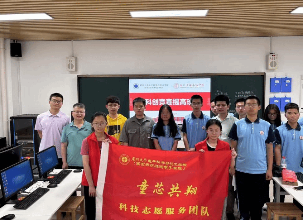 经过四年时间,电子科学与技术学院在2021年正式成立“八闽之芯”科技夏令营社会实践队,与九溪小学等建立长期合作,同时面向福建省九市一区中小学开展以“蓝色科技”“红色基因”为主线的系列科普、人文教育,并创立“童芯共翔”科技志愿服务项目,形成“普及课+社团课+集训课”的课程体系。