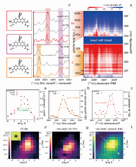 基于振动编码荧光方法的同时共点互补振动模式探测。(a) 扫描中红外波数时MSoM光致发光(PL)的热图。(b) VEF-CVS光谱。 (c) VEF-IR模式的线宽。(d) VEF-Raman模式的线宽。(e) 图(f−h)中共定位图像的强度分布(沿图(f)中白色箭头方向)。 (f−h) MSoM在特定振动模式下的同步成像:(f) 1643 cm⁻¹处的拉曼模式;(g) 1595 cm⁻¹处的红外模式;(h) aS-PL强度。插图为俯视相机拍摄的光学图像(比例尺:4 μm