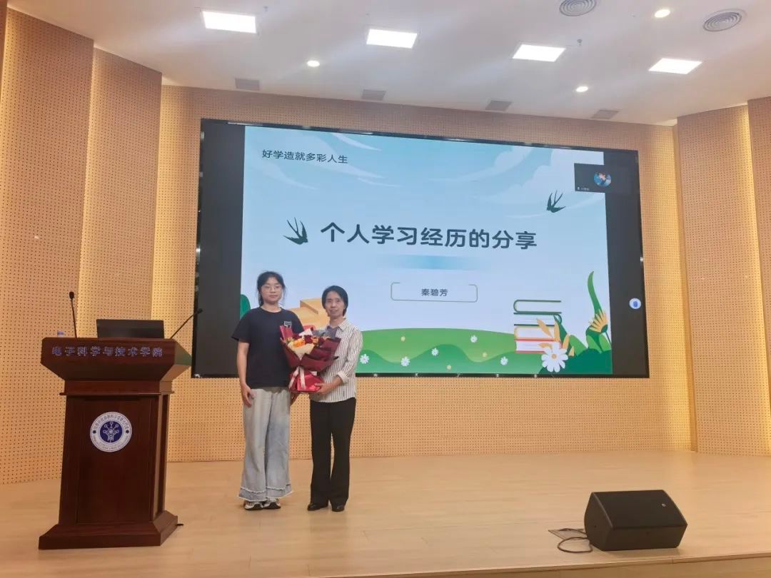 最后,学生代表向秦碧芳献花,本次分享会在热烈的氛围中圆满结束。秦碧芳校友以亲身经历为教材,以真挚的情感与深刻的见解,为同学们带来宝贵的经验启示。活动的成功举办,不仅加深了校友与学院的联系,更为在校学生树立了终身学习的榜样,激励着同学们在求知路上砥砺前行,勇攀高峰。