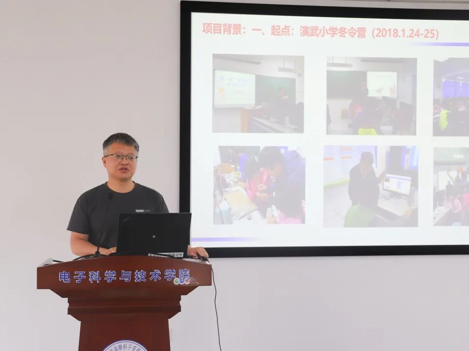 实验中心党支部书记陈华宾作学院“童心共翔”志愿服务工作成效汇报。“童芯共翔”科技志愿服务项目自2018年起持续开展,形成了具有示范意义的“党建+科普+育人”实践模式。7年以来,项目不断完善课程体系,逐步构建起多阶段课程内容的科技教育平台。项目充分发挥党支部战斗堡垒作用和青年党员的先锋模范作用,以实际行动推动思想政治教育与科技教育同向同行,为构建产教融合、校社联动的“大思政”育人格局提供有益探索。