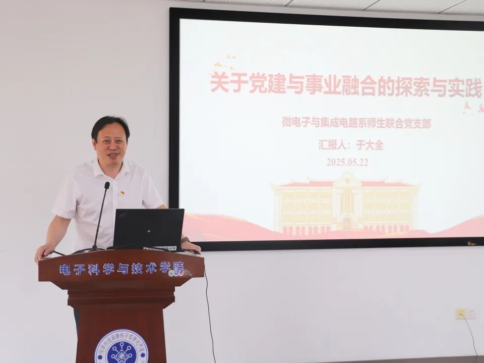 全国党建工作样板支部——微电子与集成电路系师生联合党支部书记于大全围绕“关于党建与事业融合的探索与实践”为主题作专题分享。他指出,党支部坚持立德树人根本任务,聚焦国家战略需求,以产教融合和重大科技攻关为主线,充分发挥党员先锋作用,打造具有集成电路鲜明特色的党建品牌。他表示,思想要坚,组织要强,事业要大,要着眼推进重大项目、推动集成电路与工程产品建设、深化产教融合育人,深入国家战略亟需开展党建与事业融合实践。未来,支部将继续围绕习近平总书记关于科技自立自强的重要指示,构建完善的“党建+”四大体系,助力集成电路学科实现新突破,为国家战略和地方经济发展贡献力量。