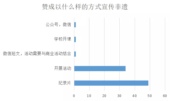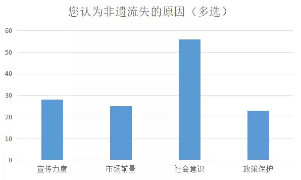 经过调查,从事非遗相关的人较少。至于非遗的流失,相当一部分人认为是社会意识的问题。在调查中,大部分人赞成通过纪录片和开展活动对非遗进行宣传,但是过半受访者对于参与活动没有太高的积极性。