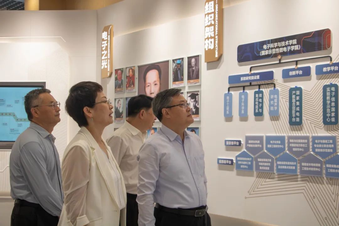 调研期间,张荣先后走访了学院教师工作室、“电子人之家”师生校友共享空间、院史文化长廊、国家集成电路产教融合创新平台展厅、“党建+科普”驿站、希龙实验室等地,认真听取了学院工作汇报,了解学院在党建品牌、学科建设、科学研究、发挥校友育人作用等方面的工作成效,并与学院师生、校友代表亲切交流。