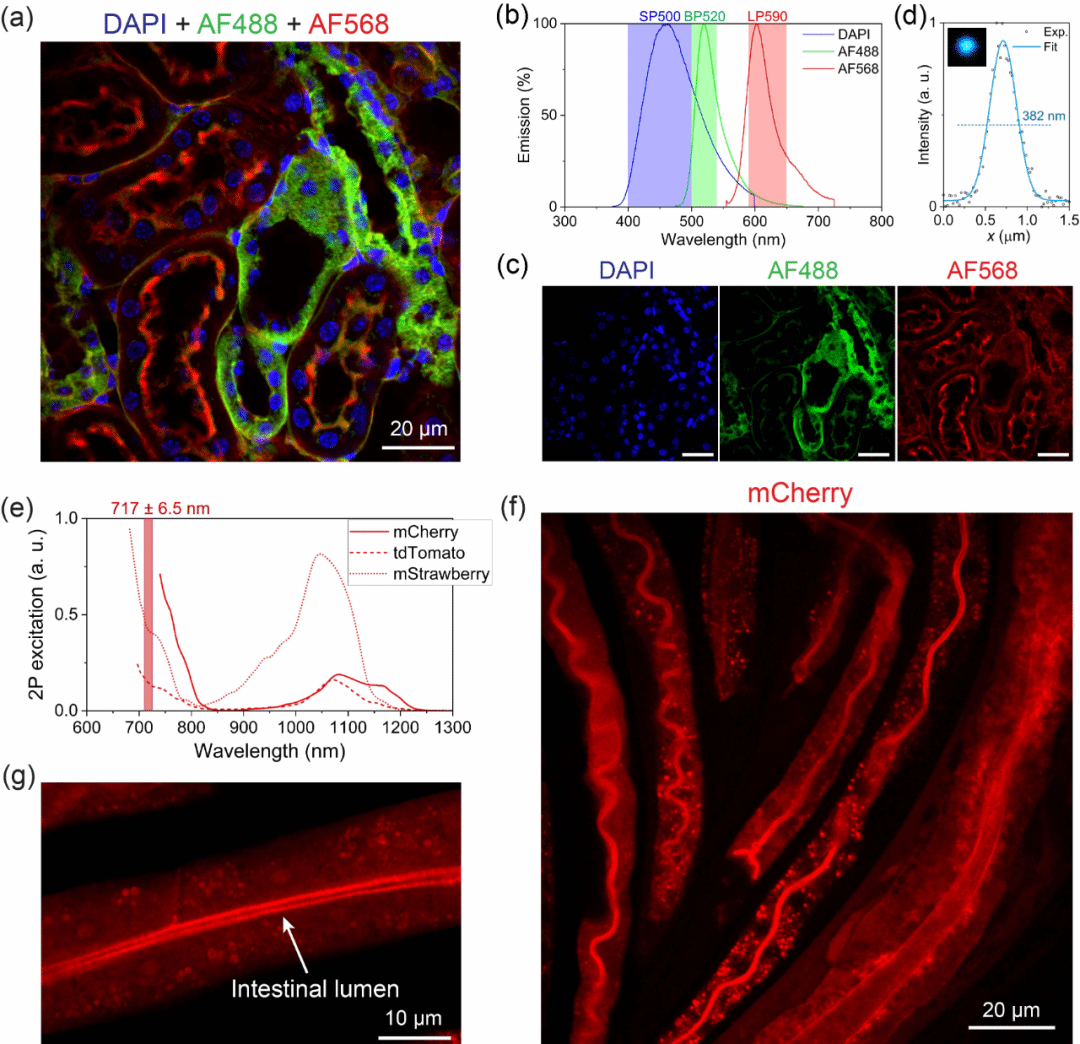 图2 深红光锁模飞秒光纤激光器作为激发光源在双光子显微镜中的应用:(a)激发蓝、绿和红荧光标记物的复合双光子图像;(b)DAPI、AF488、AF568的发射光谱;(c)三种染料的分离图像;(d)实测的点扩散函数;(e)mCherry、tdTomato、mStrawberry的双光子激发光谱;(f-g)mCherry标记线虫肠腔双光子成像实验结果