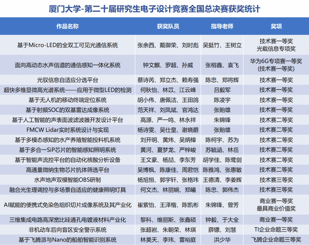 我校学子共斩获全国一等奖8项(其中技术赛5项、企业专项赛1项、商业赛2项),二等奖6项(技术赛6项),三等奖4项(其中技术赛2项、企业专项赛2项)。此外,一支技术赛一等奖团队同时荣获“光载信息”专项奖(全国仅10支),一支商业赛一等奖团队同时荣获“最具商业价值奖”(全国仅6支)。厦门大学荣获全国总决赛优秀组织单位,在333所参赛高校和科研院所中,我校团体总分位列全国第三名,电子科学与技术学院陈忠、吕毅军、吴挺竹、张贻雄、朱锦锋、钟毅,信息学院陈凌宇、张榕鑫等8位老师荣获优秀指导教师。