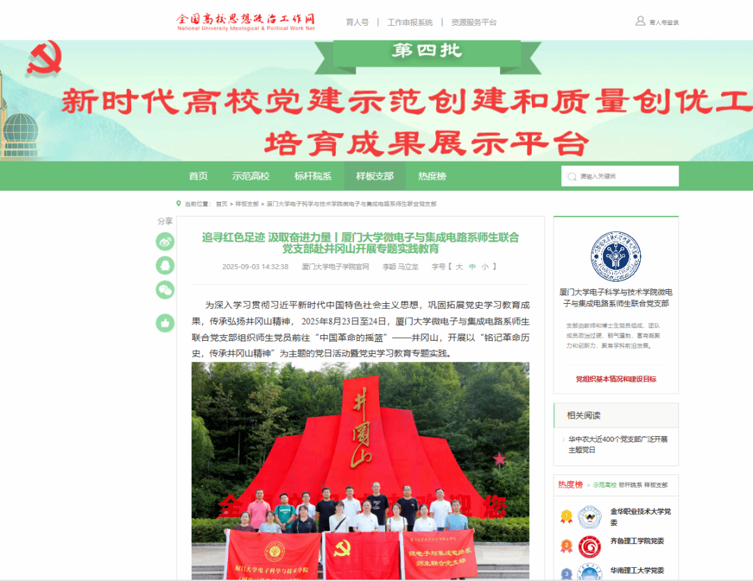 为深入学习贯彻习近平新时代中国特色社会主义思想,巩固拓展党史学习教育成果,传承弘扬井冈山精神, 2025年8月23日至24日,微电子与集成电路系师生联合党支部组织师生党员前往“中国革命的摇篮”——井冈山,开展以“铭记革命历史,传承井冈山精神”为主题的党日活动暨党史学习教育专题实践,相关活动获得全国高校思想政治网报道。