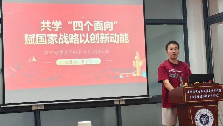 2022级微电子科学与工程团支书黎子恒为大家讲解了“四个面向”的具体内容,并介绍道:“四个面向”是我国科技创新发展的核心战略导向,它为科技事业和国家发展指明了主攻方向、确立了基本原则、聚焦了关键重点、树立了价值导向。“四个面向”鼓励我们探索未知领域、挑战人类认知极限,抢占未来科技竞争制高点。同时,科技创新要针对国家重大需求,与产业升级深度融合,并“以人为本”,用科技造福人民。从“九章”量子计算机弯道超车突破计算速度瓶颈,到嫦娥六号实现人类历史上首次月球背面采样并返回,科技创新正如一股股“源头活水”,持续为我国高速高质量发展提供磅礴势能。作为芯青年,我们更应该不断努力,砥砺前行,担当时代责任,练就过硬本领,发扬科技创新精神,以青春之力、以奋斗之资,共同书写中国式现代化新答卷。