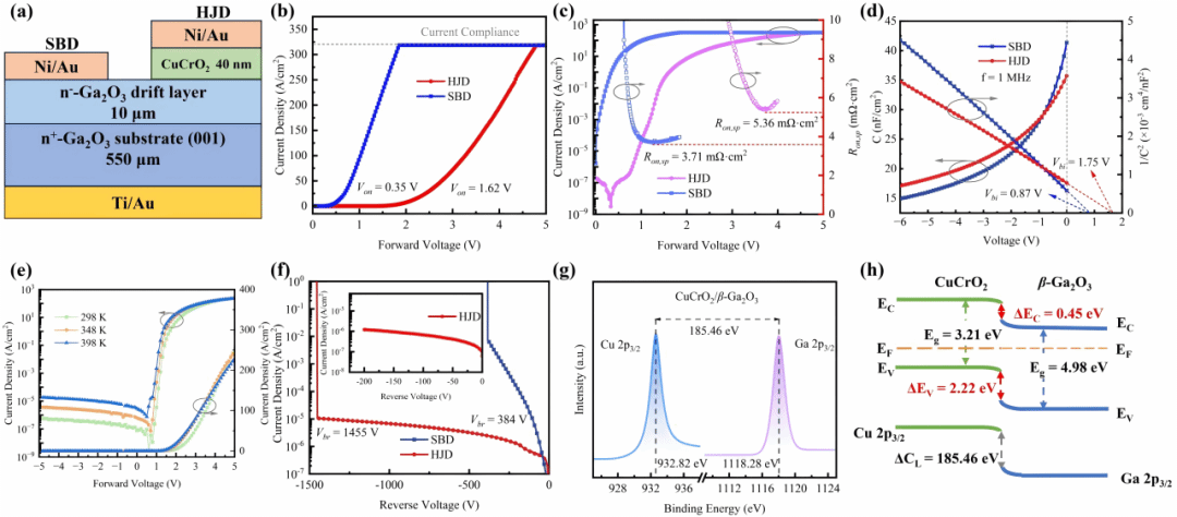 此外,研究团队设计并研制了新型Ga2O3基pn异质结二极管(HJD),引入新型p型材料CuCrO2形成pn异质结结构。所制备的CuCrO2/Ga2O3 pn异质结二极管的击穿电压高达1.46 kV,漏电流低至10-5 A/cm2,其性能比传统的β-Ga2O3 SBD提高了近四倍。同时,HJD的导通电压为1.62 V,导通电阻为5.36 mΩ∙cm2。研究成果如图3所示。
