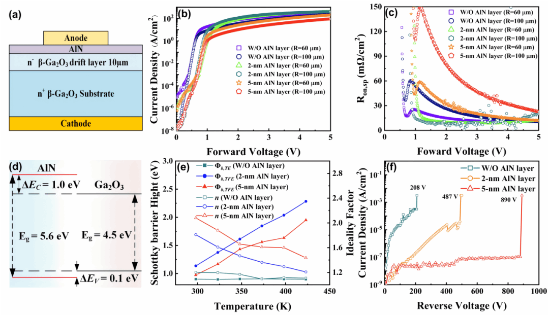 在Ga2O3功率器件方面,研究团队通过在Al2O3/β-Ga2O3界面进行原子氮处理,将垂直沟槽型β-Ga2O3金属-绝缘体-半导体(MIS)肖特基势垒二极管(SBD)的击穿电压从832 V提升至1200 V,同时保持了0.9 V的低开启电压和12.1 mΩ·cm2的低比导通电阻。研究成果如图1所示。同时,研究团队通过原子层沉积(ALD)技术在β-Ga2O3表面生长AlN薄膜,成功在金半界面处引入了AlN势垒层,显著提升了器件性能。所制备的平面型β-Ga2O3 SBD实现了低至0.1 μA/cm2的超低泄漏电流,其击穿电压从208 V大幅提升至890 V,同时仍保持较低的开启电压和较低的导通电阻。研究成果如图2所示。