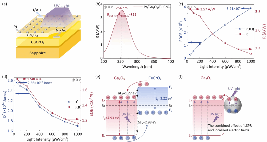 图5 纳米Pt/非晶Ga2O3/晶态CuCrO2异质结构光电探测器结构、性能和能带示意图