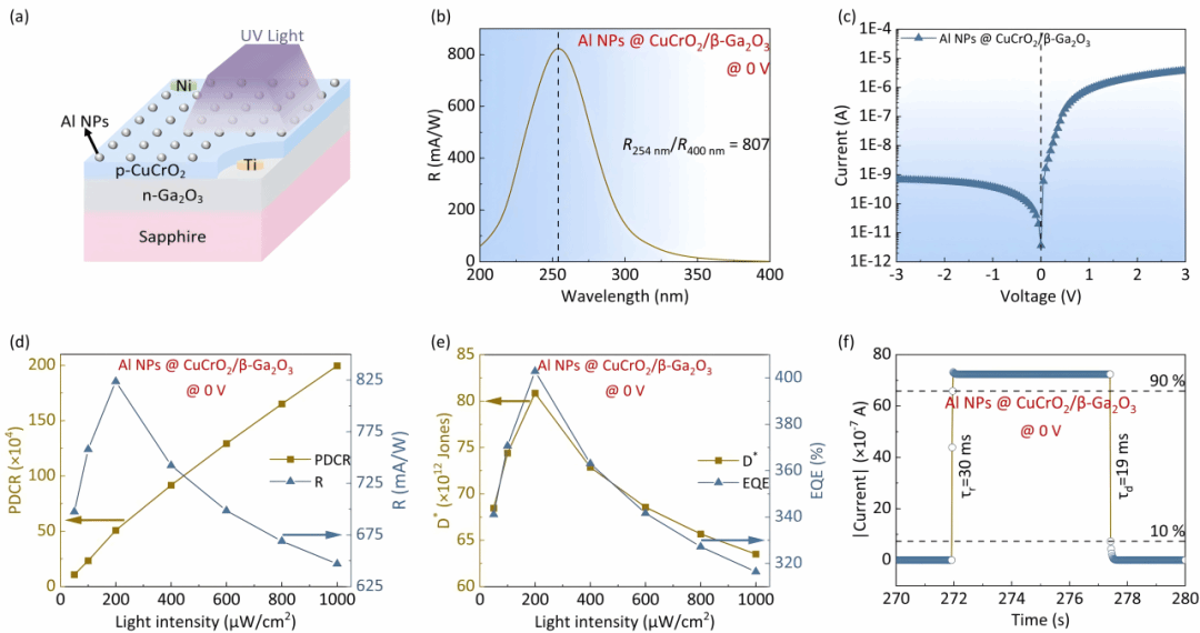 图4 含有Al纳米颗粒的CuCrO2/β-Ga2O3异质结光电探测器结构和性能