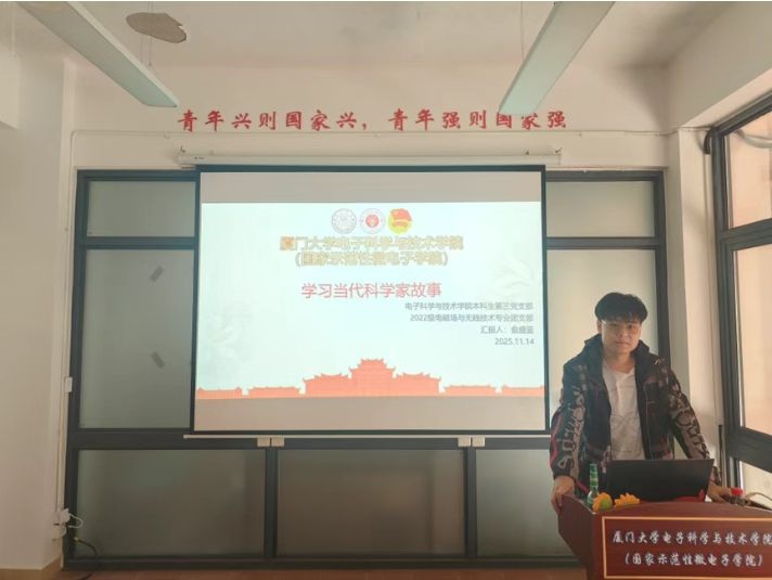 2022级电磁场与无线技术专业团支书俞盛蓝为大家介绍了两位时代榜样——一位是点亮物理星空的科学巨匠,一位是守护生命之光的医学泰斗。他们用一生践行初心,用坚守诠释担当,为我们立起了精神的丰碑,更让我们读懂了“初心”与“使命”的深刻内涵。