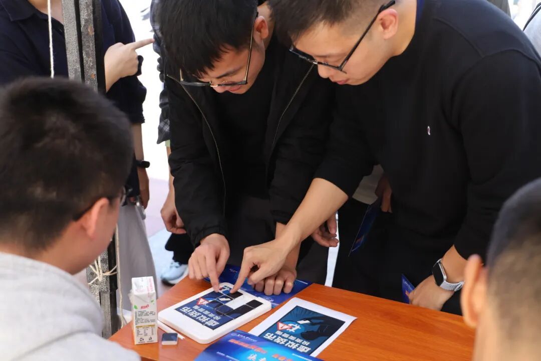 在 「反诈拼图大挑战」 前,同学们指尖滑动,精巧地完成华容道,拼出完整的反诈海报与警示金句,将逻辑思维与关键信息紧密结合。