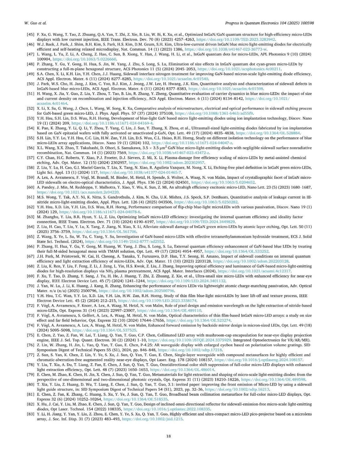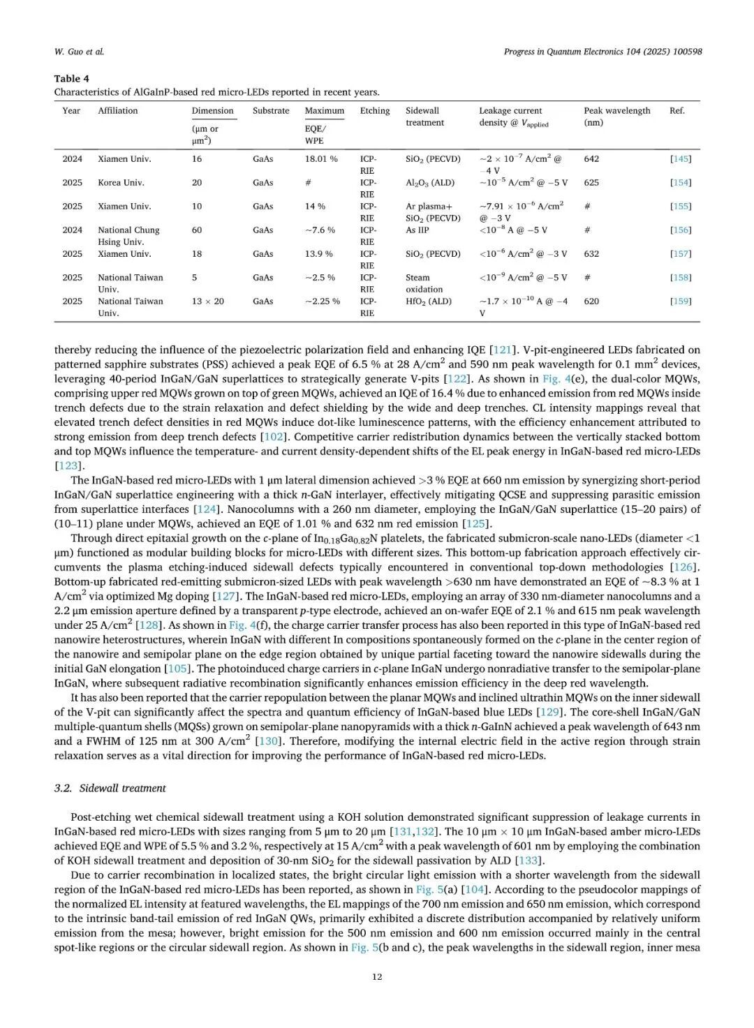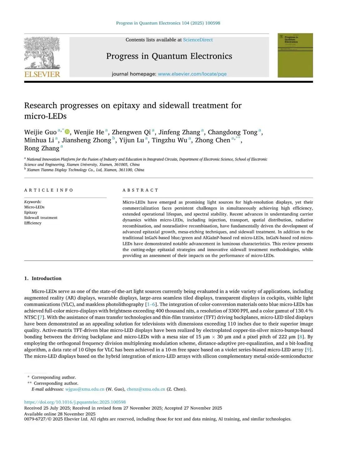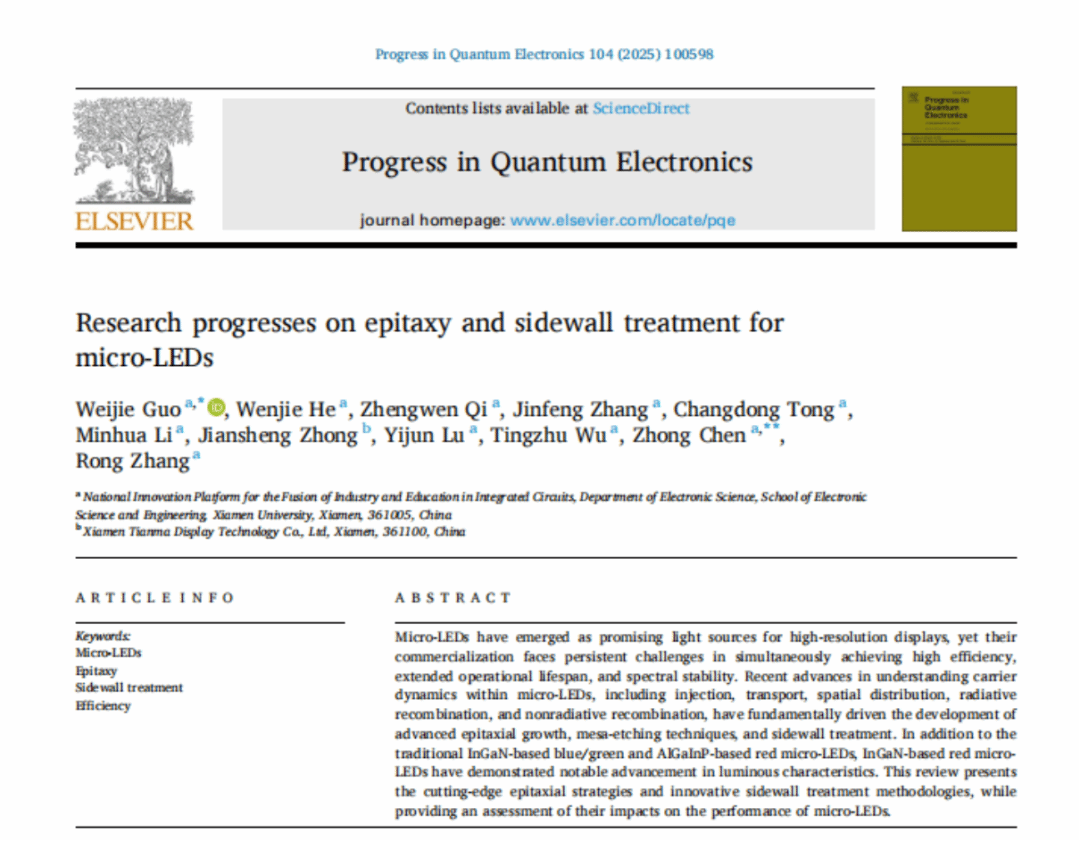 近日,厦门大学张荣、陈忠、郭伟杰团队在国际权威期刊《Progress in Quantum Electronics》发表题为“Research progresses on epitaxy and sidewall treatment for micro-LEDs”的邀稿综述。系统综述了近年来Micro-LED外延生长、像素隔离、侧壁处理及全彩集成等领域的研究进展,重点阐述了有效揭示微观结构与器件光电性能间构效关系的科学发现,并展望了该领域的关键攻关方向。