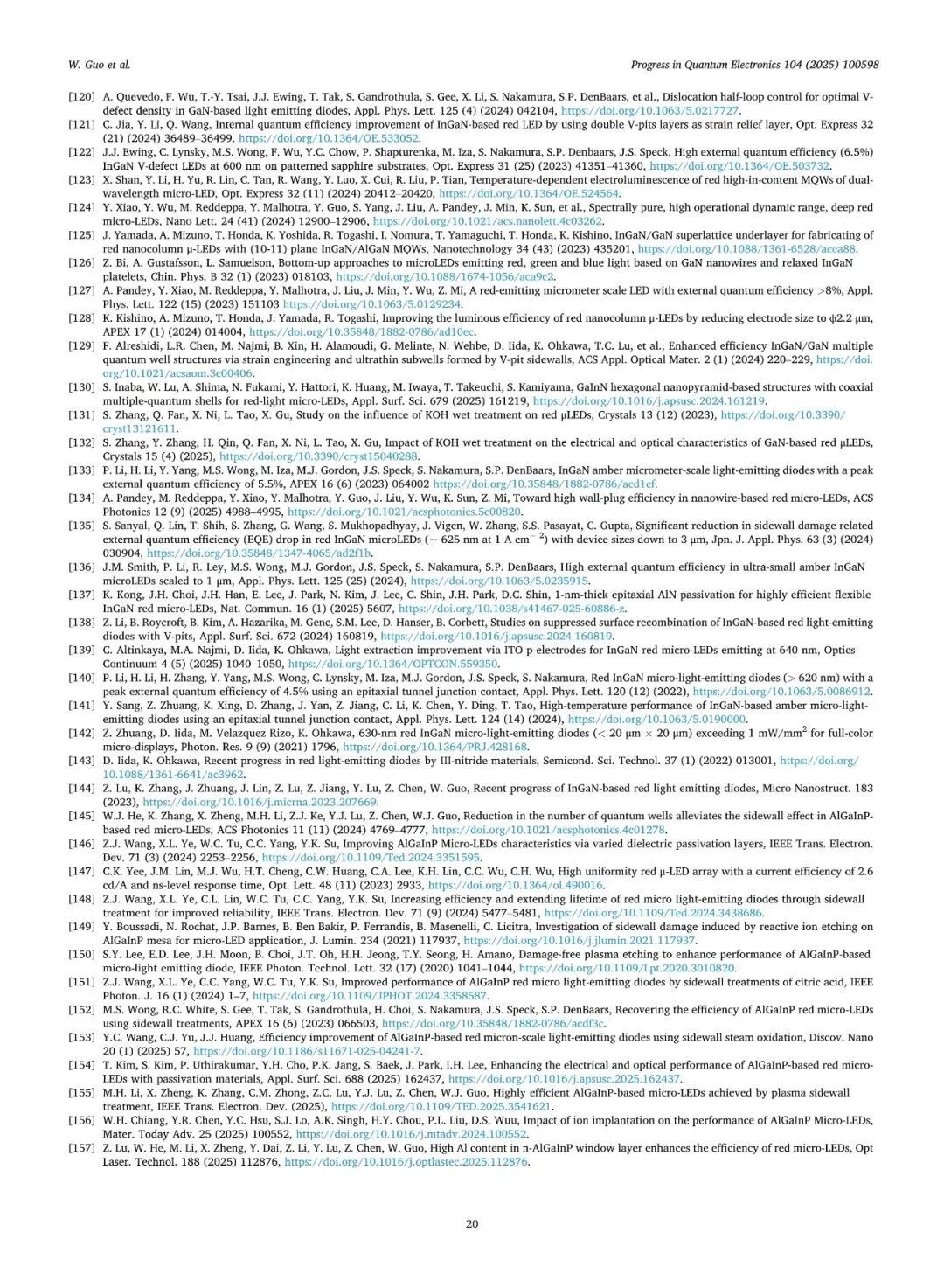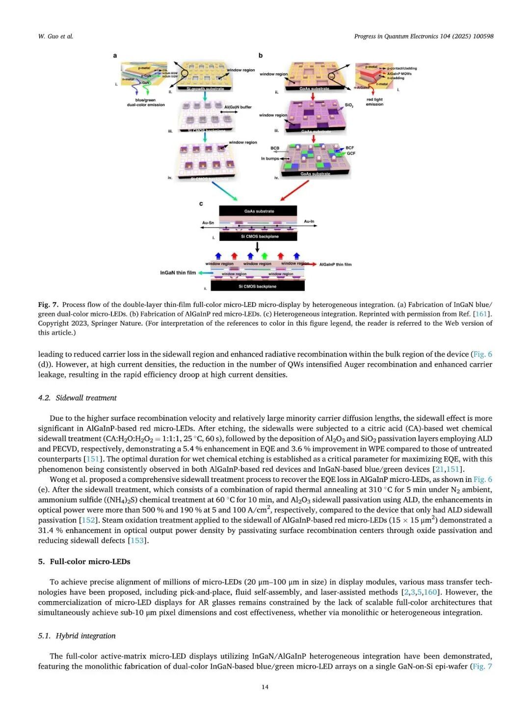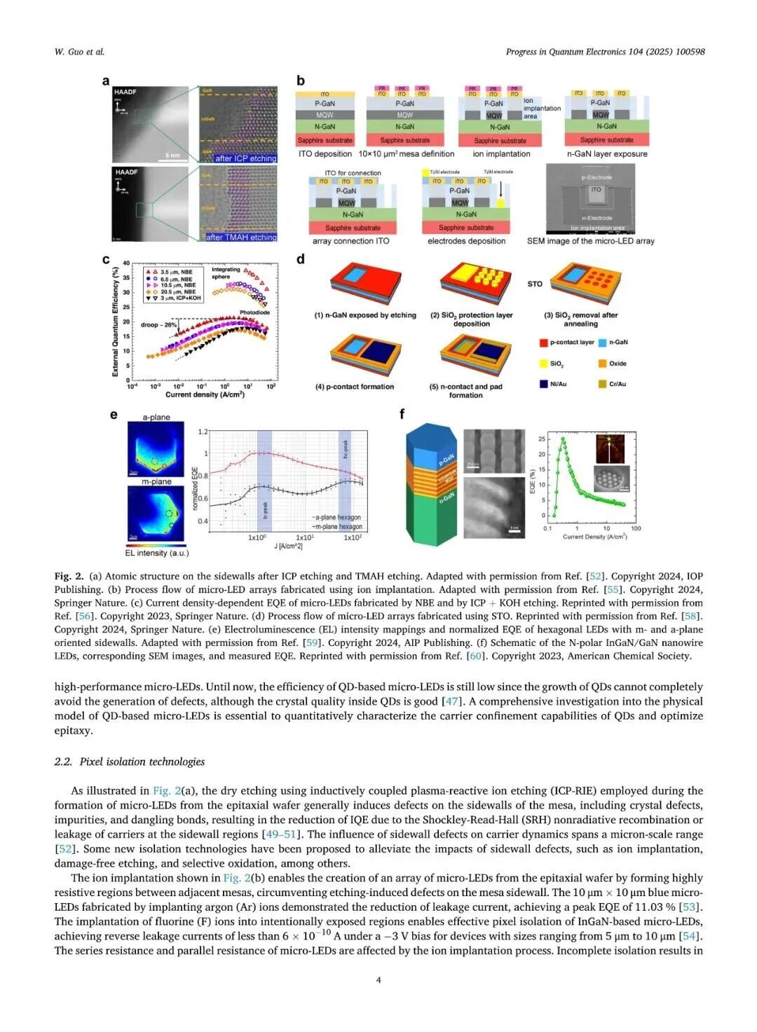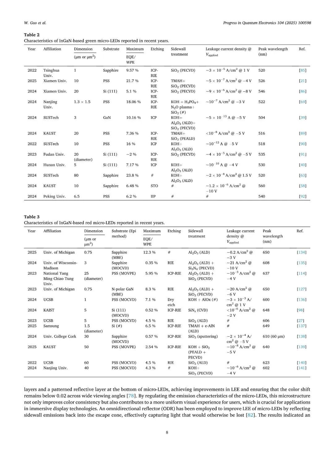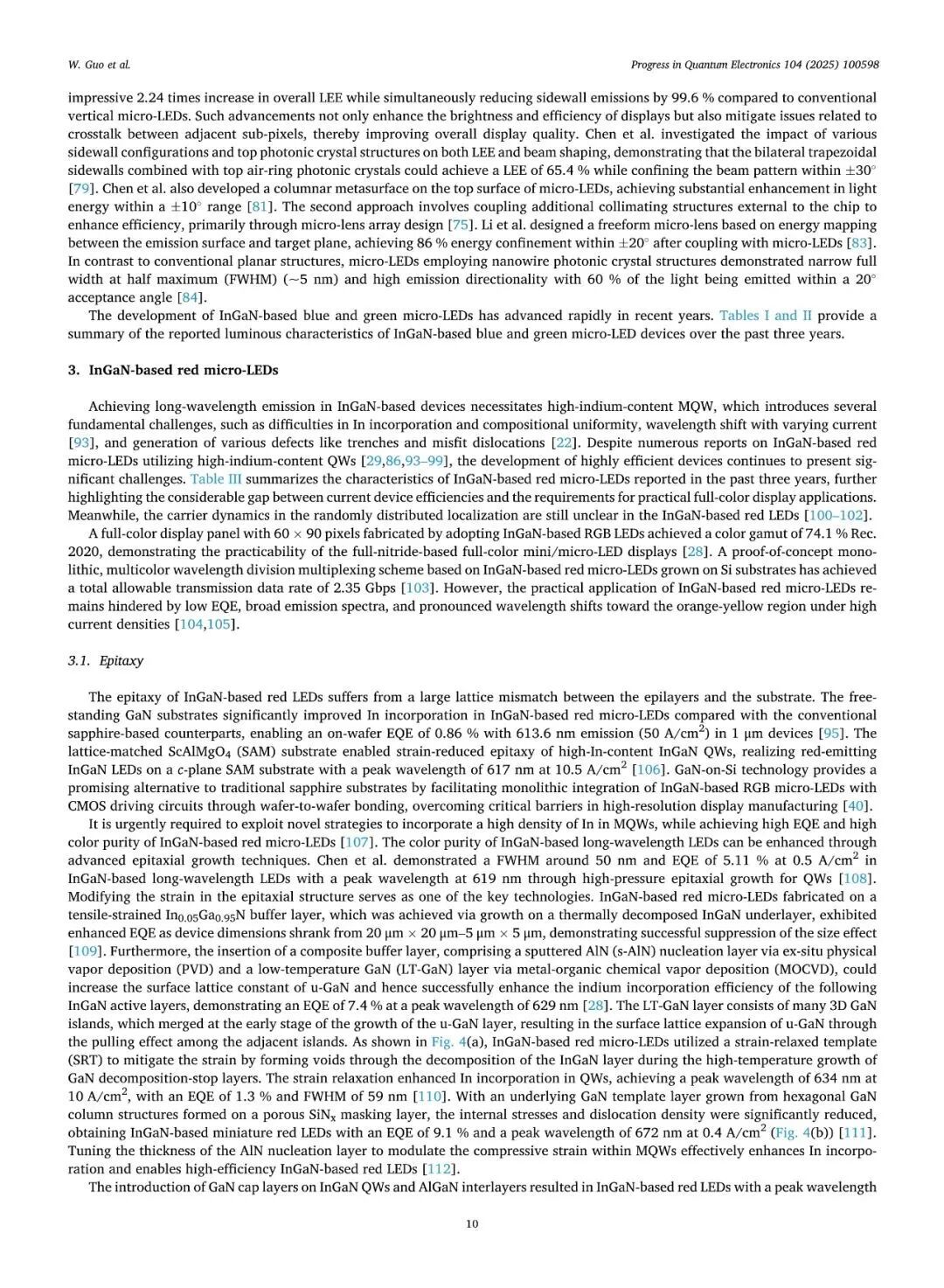 近日,厦门大学张荣、陈忠、郭伟杰团队在国际权威期刊《Progress in Quantum Electronics》发表题为“Research progresses on epitaxy and sidewall treatment for micro-LEDs”的邀稿综述。系统综述了近年来Micro-LED外延生长、像素隔离、侧壁处理及全彩集成等领域的研究进展,重点阐述了有效揭示微观结构与器件光电性能间构效关系的科学发现,并展望了该领域的关键攻关方向。