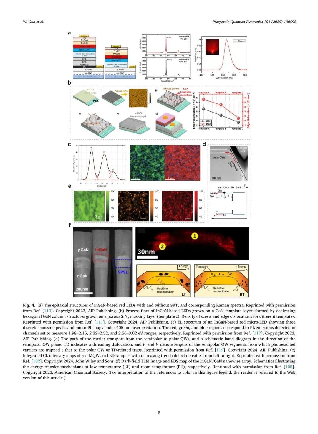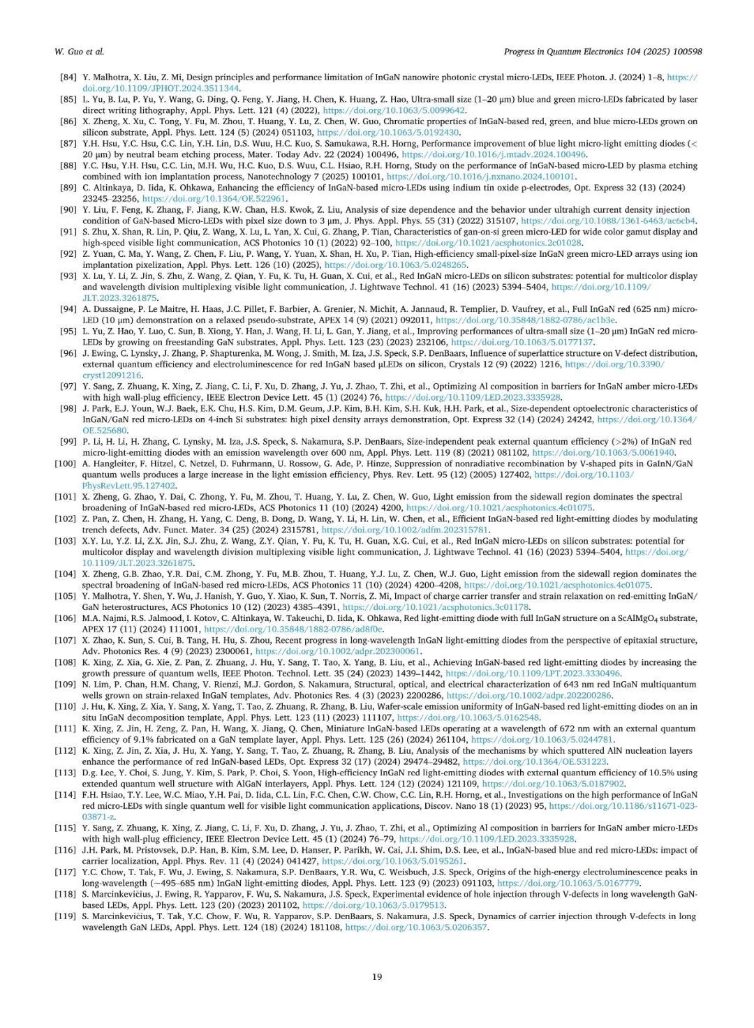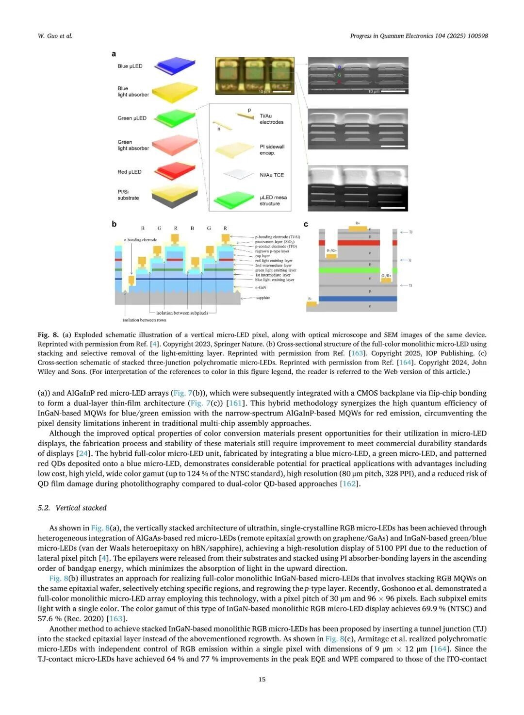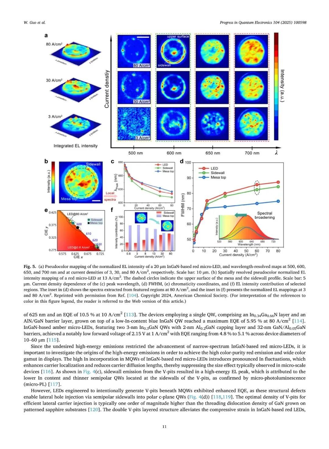 近日,厦门大学张荣、陈忠、郭伟杰团队在国际权威期刊《Progress in Quantum Electronics》发表题为“Research progresses on epitaxy and sidewall treatment for micro-LEDs”的邀稿综述。系统综述了近年来Micro-LED外延生长、像素隔离、侧壁处理及全彩集成等领域的研究进展,重点阐述了有效揭示微观结构与器件光电性能间构效关系的科学发现,并展望了该领域的关键攻关方向。