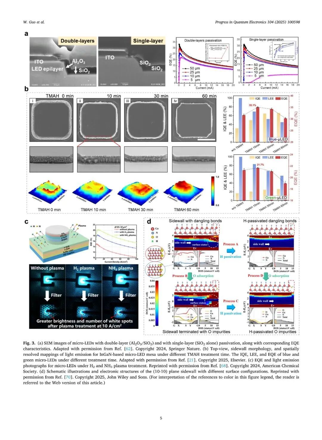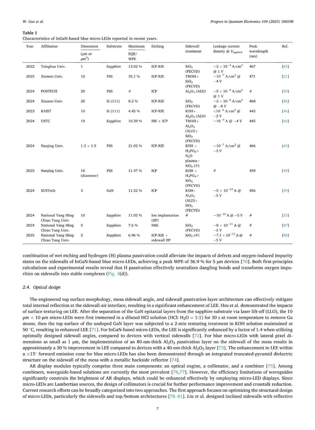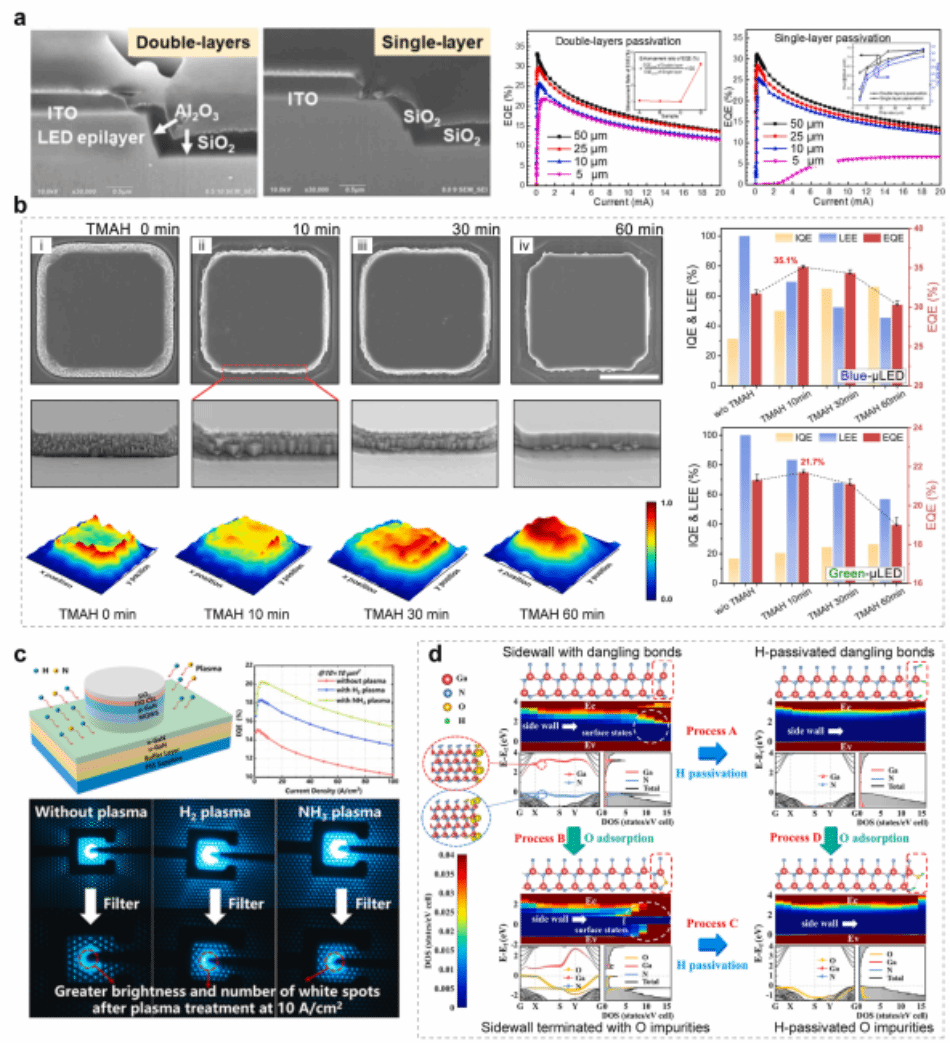 高分辨率Micro-LED显示,要求Micro-LED芯片尺寸要足够小。但是,器件制备的干法蚀刻过程,会在Micro-LED台面侧壁引入缺陷,造成载流子非辐射复合,导致Micro-LED的发光效率随尺寸缩小而快速下降。近期的相关研究表明,干法蚀刻后的侧壁处理,可以有效地削弱侧壁缺陷的不利影响。侧壁区域不仅影响Micro-LED的内量子效率,还影响其光提取效率。在侧壁处理过程中,内量子效率与光提取效率之间面临竞争关系,精准地调节两者间竞合关系,才能够实现发光效率的有效优化。