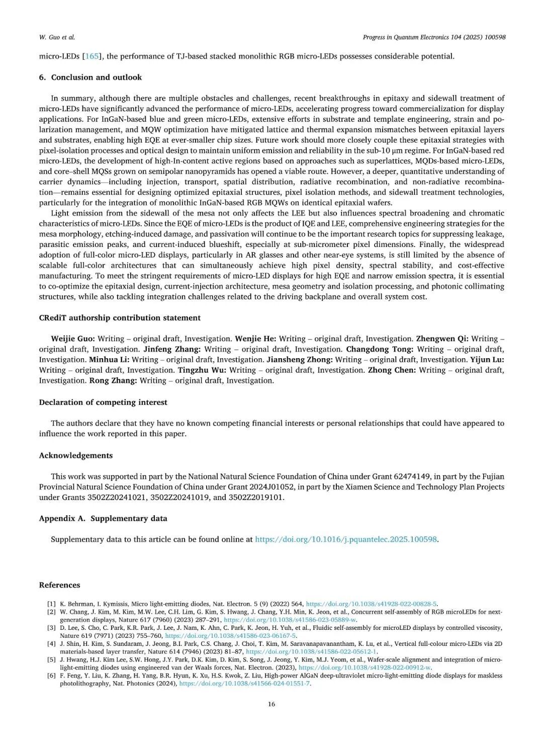 本综述指出,尽管Micro-LED在效率提升、全彩集成等方面仍存挑战,但外延设计、刻蚀工艺、侧壁后处理的协同优化已显著提升器件性能。未来仍需深化载流子动力学定量研究,推动外延、蚀刻、侧壁处理、光分布调控协同优化,攻克驱动背板集成与制造成本难题,以加速其显示领域的规模化落地。