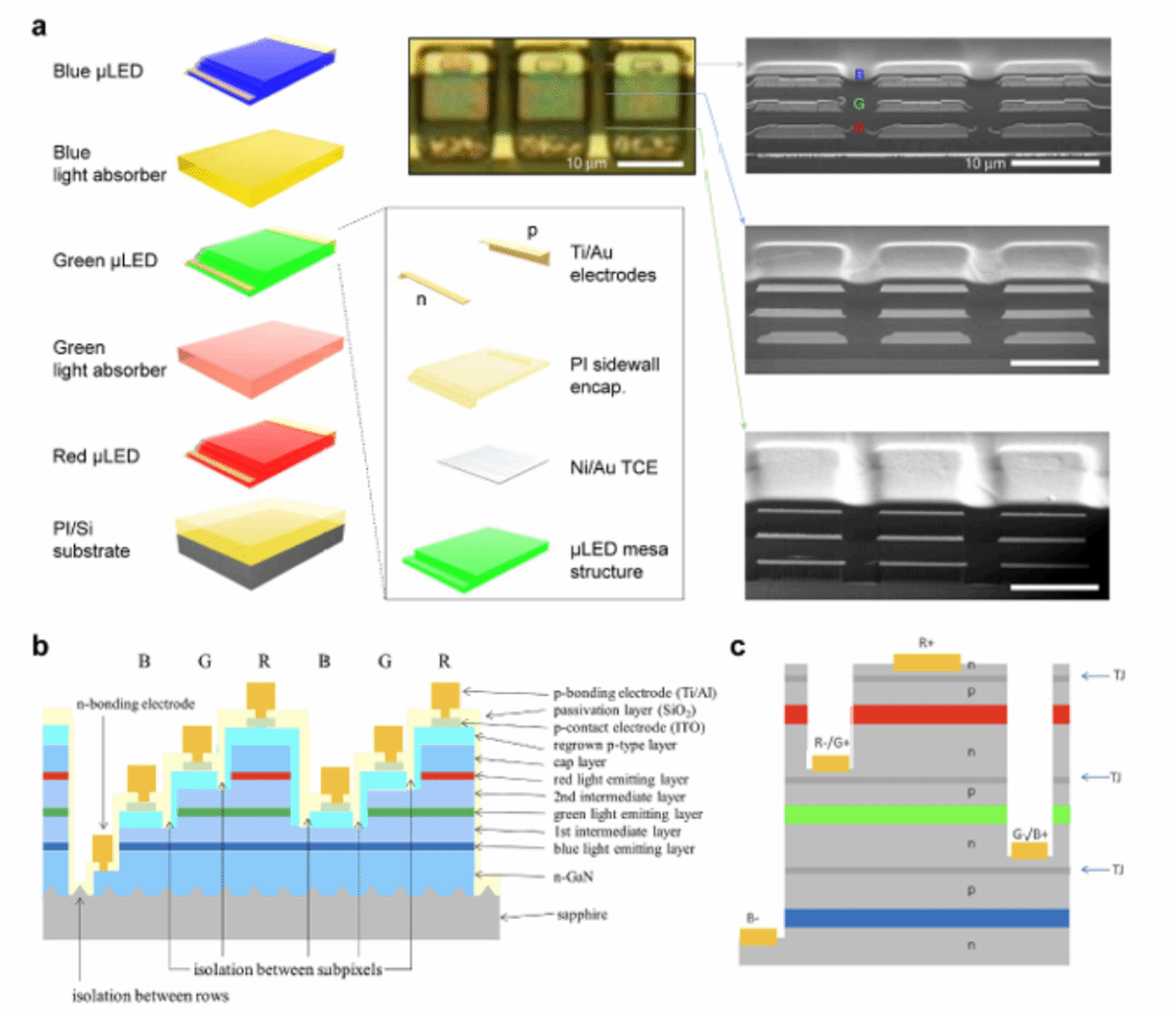 全彩化是Micro-LED显示的核心目标,目前主流技术分为异质集成与垂直堆叠两大路线。将InGaN基蓝光、绿光Micro-LED阵列与AlGaInP基红光Micro-LED阵列,通过倒装键合与CMOS背板集成形成异质集成架构,兼具InGaN基器件高量子效率与AlGaInP基器件窄光谱优势。通过RGB量子阱垂直堆叠与选择性刻蚀相结合的单片集成方案,已经实现了30μm像素间距的像素阵列。这些工作都为全彩器件性能的突破奠定了基础。