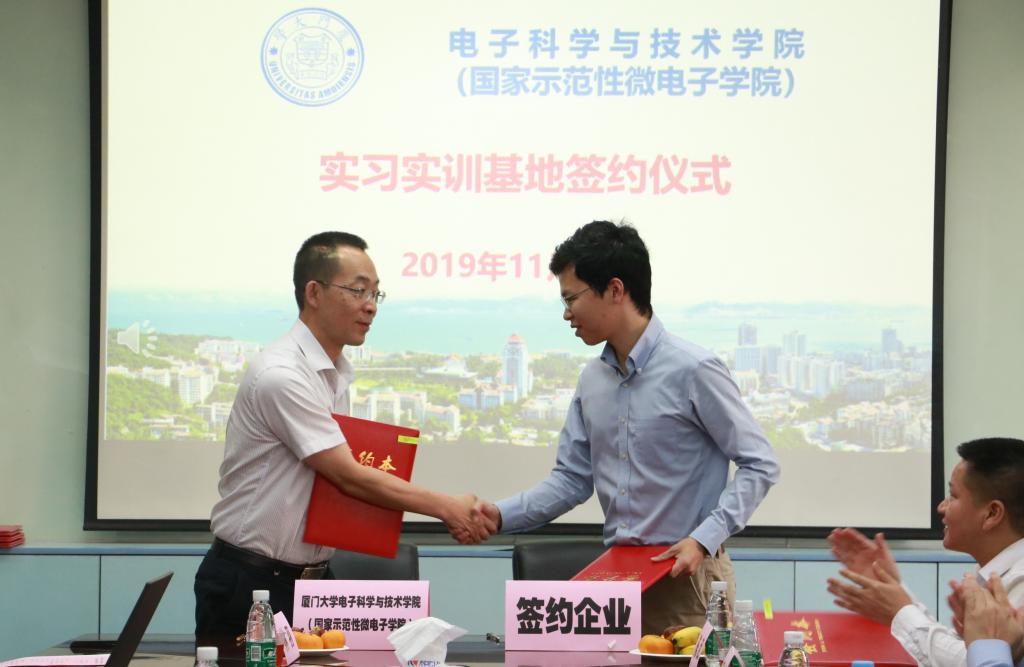 为促进电子信息领域人才培养,提高学生服务产业的能力,厦门大学电子科学与技术学院(国家示范性微电子学院)与龙芯中科技术有限公司、杭州海康威视数字股份有限公司、锐捷网络股份有限公司、福州瑞芯微电子股份有限公司、福建联迪商用设备有限公司、新大陆支付技术有限公司、厦门信息集团有限公司、厦门海沧信息产业发展公司、厦门市美亚柏科信息股份有限公司、厦门市三安集成电路有限公司、联芯集成电路制造(厦门)有限公司、厦门优迅高速芯片有限公司、厦门信和达电子有限公司、厦门士兰集科微电子有限公司、厦门通富微电子有限公司、厦门云天半导体科技有限公司、立达信物联科技股份有限公司、宏泰机电科技(厦门)有限公司、深圳信步科技有限公司、深圳市浩源光电技术有限公司等20家单位签订了实习实训基地合作协议。通过实习实训基地平台,学生可以参与企业生产实践,熟悉企业生产环节,感受企业文化氛围,积累工作经验,提高就业竞争力。在此基础上,企业和学生可以进行双向选择,有效缩短了人才选拔周期,节约招聘成本,从而实现企业选拔高素质人才与学生成功就业的双赢。