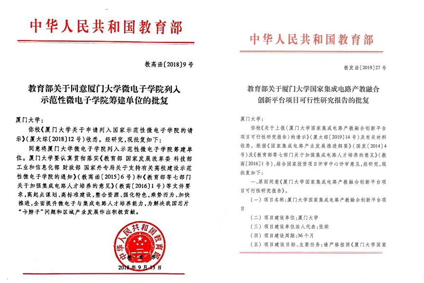 学生在创新创业领域取得的突出成果是学院人才培养、科技创新能力的有力佐证。2019年5月,教育部下发《教育部关于厦门大学国家集成电路产教融合创新平台项目可行性研究报告的批复》(教发函〔2019〕14号),正式批复同意厦门大学承建“国家集成电路产教融合创新平台”。学院将以此为契机,不忘“立德树人”初心,牢记“培育人才”使命,聚焦国家集成电路领域“卡脖子”问题,加快集成电路领域关键核心技术攻关,加强集成电路领域专门人才培养,推进海西经济区集成电路产业升级,带动海峡西岸集成电路产业与人才聚集,为福建省和厦门市半导体集成电路产业发展提供人才和技术支撑。