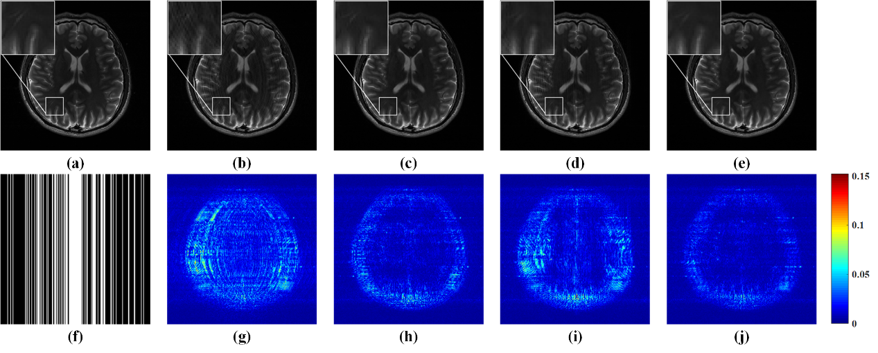 图 2. 3倍加速下的4通道人脑数据重建结果及误差。(a)全采样数据参考图像;(b-e) GRAPPA、-SPIRiT、ALOHA和所提方法的重建图像;(f)3倍加速的采样模板;(g-j)相应的重建误差分布图。(b-e)图的相对二范数误差RLNE分别为:0.1335,0.0866,0.1117,0.0735。
