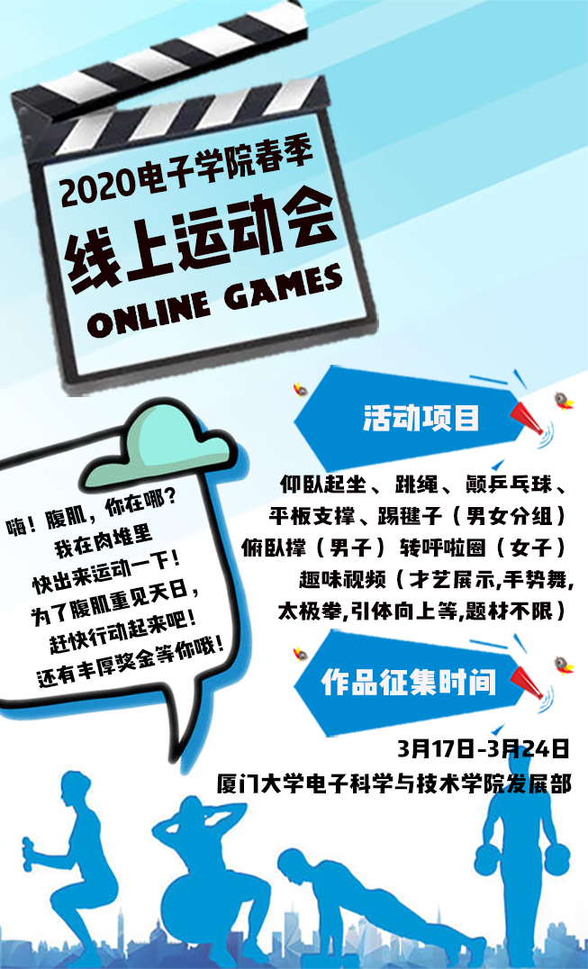 受新冠肺炎疫情影响,学生日常的体育运动节奏被无情打断。为响应学校疫情防控工作要求,近日,厦门大学电子科学与技术学院举办了第一届线上运动会,赛期持续2周,覆盖全院1309名学生,最终产生36名“运动达人”。本次线上运动会集群众性、专业性、趣味性于一体,打破了户外体育运动的固有模式,解锁了居家体育运动的“新姿势”,学生参与多、锻炼效果好。