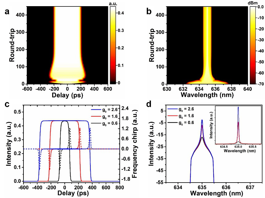 图1.可见光被动锁模光纤激光器的数值模拟结果。(a)脉冲演化;(b)相应的光谱演化;(c)脉冲时域波形(实线)和相应的频率啁啾(虚线);(d)锁模激光光谱。