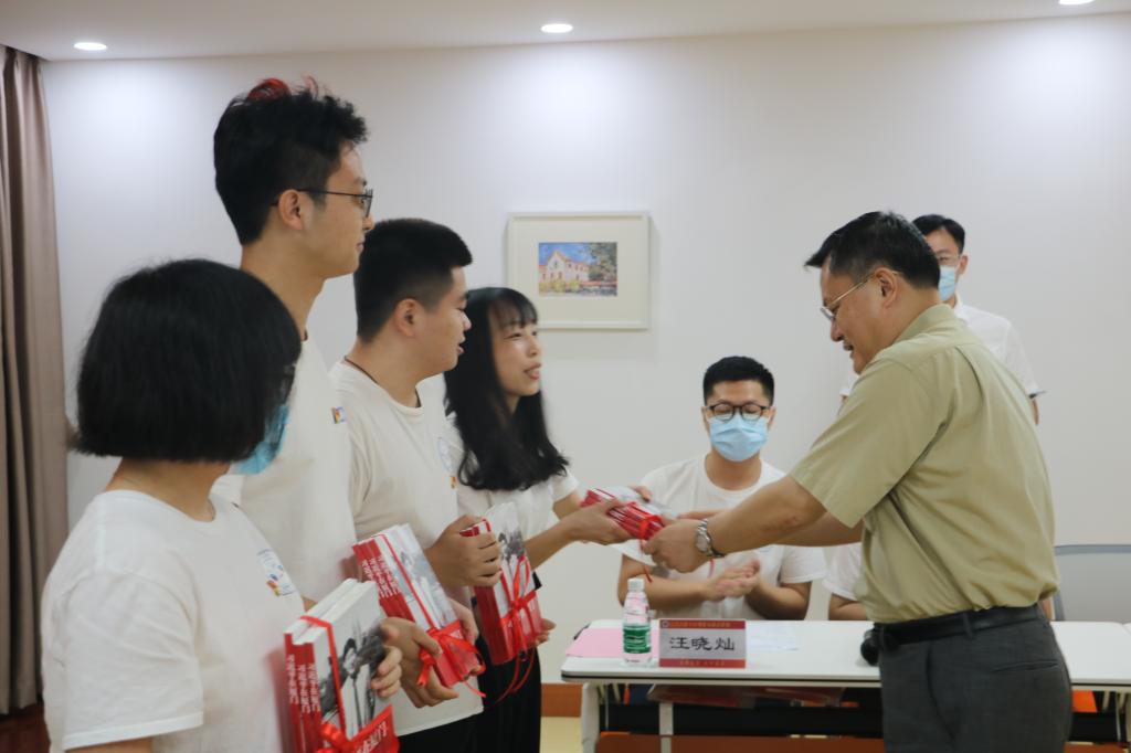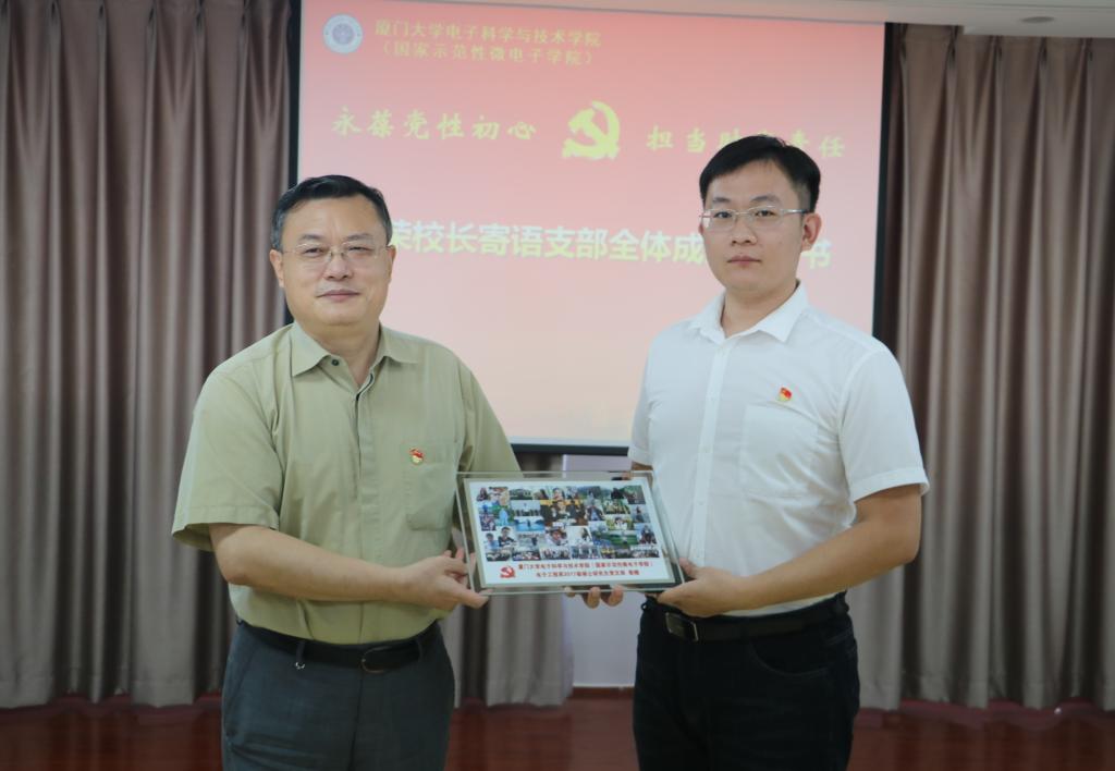 自2018年11月1日挂点联系支部以来,张荣校长一直关心、支持电子工程系2017级硕士研究生党支部的建设情况。在毕业之际,张荣校长将书籍《习近平在厦门》赠送给了支部党员们。为了表达对张荣校长的感激之情,支部全体党员精心制作了一张支部“全家福”,赠予张荣校长留念。最后,张荣校长细心地叮嘱同学们,在毕业前夕要继续戴好口罩,尽量不要聚集,做好个人的安全防护。