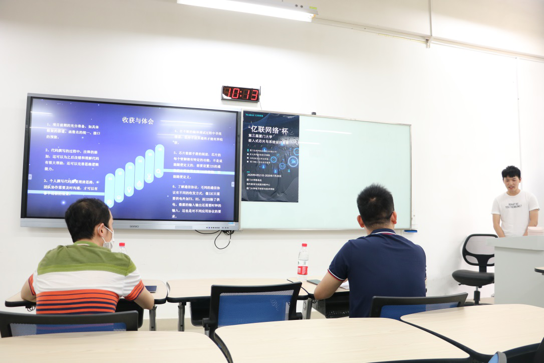 刘传尧与郑莉分别代表厦门大学现代教育技术与实践训练中心、电子科学与技术学院对此次竞赛的成功举办表示祝贺。冯万健代表亿联网络公司,对此次大赛师生成果表示肯定,向大家介绍了亿联网络的技术优势、人才培养与晋升体系,鼓励同学们继续增强自身科研能力。陈华宾、林炳分别作为校方、企业指导老师进行了赛事总结。双方老师肯定了参赛学员的成长与进步,欣赏学员们从无到有实现做作品相应功能,并鼓励同学们在今后更多地参与类似活动,挑战自我,锻炼提升。