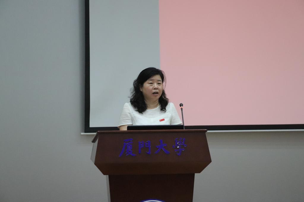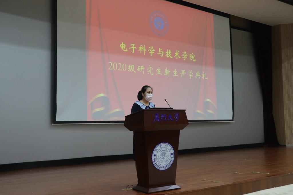 吴国瑛书记代表全体师生向2020级新同学表示热烈欢迎。吴书记讲到,2020年是特殊的一年,面对疫情,党中央坚持人民至上、生命至上,带领中国人民众志成城、共克时艰,夺取了全国抗疫斗争重大战略成果;这中间涌现出一大批可歌可泣的先进典型,希望大家铭记这段特殊的时光,深入学习、大力弘扬生命至上、举国同心、舍生忘死、尊重科学、命运与共的伟大抗疫精神。值厦大百年华诞之际,她希望同学们牢记厦门大学“爱国、革命、自强、科学”四种精神,薪火相传,自强不息,勇于担负责任,坚持“四个面向”,不断向科学技术广度和深度进军,培养创新意识、创新能力,顺势而为,发挥专业优势,与百年学府同步开启青春新起点。最后,她向同学们提出以下五点要求:希望同学们志存高远,做兼济天下的追梦人;开拓创新,做时代改革的弄潮儿;自强不息,做止于至善的奋斗者;锲而不舍,做孜孜不倦的钻研者;严谨治学,做学术道德的捍卫者。珍惜韶华,德才并重,情理兼修,勇于开拓,传承百年荣光、展现南强风采,在实践中提升学术和人生境界,在奋斗中谱写精彩的人生华章。