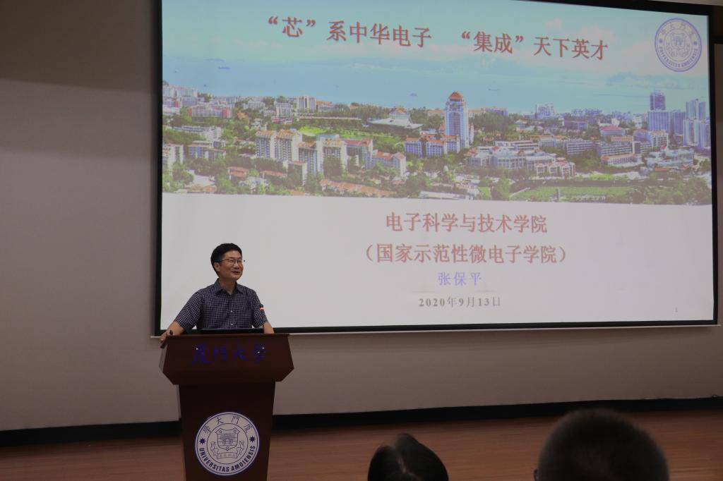 张保平副院长对学院建设状况、学科发展背景、人才培养等方面做了简要介绍,并表示当下中美科技战,是当今时代给予我们的机遇和挑战,应充分利用“国家集成电路产教融合创新平台”、“国家软件与集成电路人才培训(厦门)基地”、“教育部电子信息国家级实验教学示范中心”、“教育部微纳光电子材料与器件工程研究中心”及许多省级、市级平台,努力为解决“卡脖子”问题贡献自己的力量。同时,张副院长简明扼要、直击重点地讲解,为同学们带来了意义非凡的开学第一课——“如何做科研”,选好课题,积极与导师沟通,端正态度,虚心求教,勤读善思,设立学习目标,开启人生篇章。