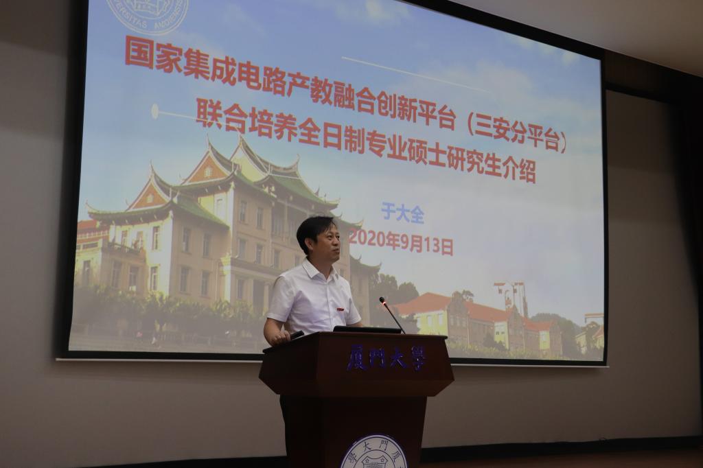 于大全主任就国家集成电路产教融合创新平台(三分安平台)联合培养全日制专业硕士研究生情况进行介绍。他表示,该平台通过双导师制度,学院与企业共同确定学生研究内容,联合培养所需专业人才,旨在聚焦解决国家“卡脖子”问题,推进集成电路产业升级,带动海峡西岸集成电路产业与人才培养,为产业发展提供人才和技术支撑。厦门市三安光电股份有限公司人力资源中心副总经理林锦结合于主任所讲情况进行现场答疑。