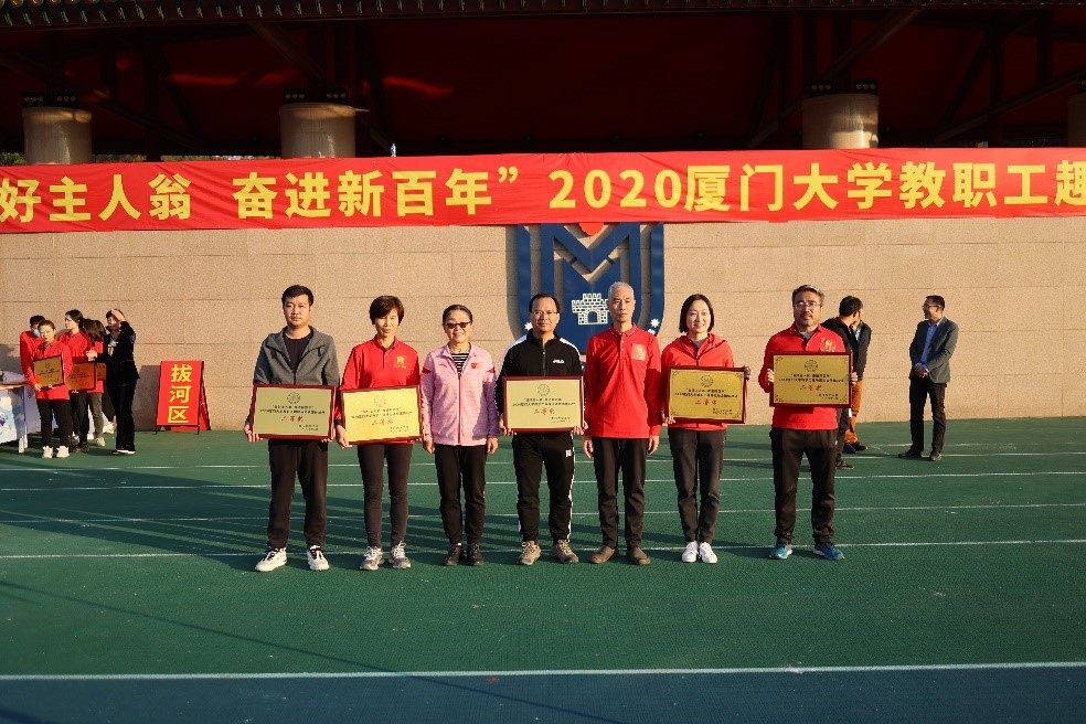 12月28日下午,在喜迎厦门大学百年校庆倒计时100天之际,“当好主人翁,奋进新百年”厦门大学教职工喜迎百年华诞趣味运动会在思明校区演武运动场隆重举行。我院教职工参加了包括健身操表演、拔河、卓越圈、跳绳等全部项目。其中在拔河比赛中三战全胜,最终取得了总成绩全校二等奖的佳绩。学院党委吴国瑛书记、院长陈忠教授和方银水副书记莅临赛场指挥比赛,吴国瑛书记还参加了工间操比赛,极大地鼓舞了团队的士气。