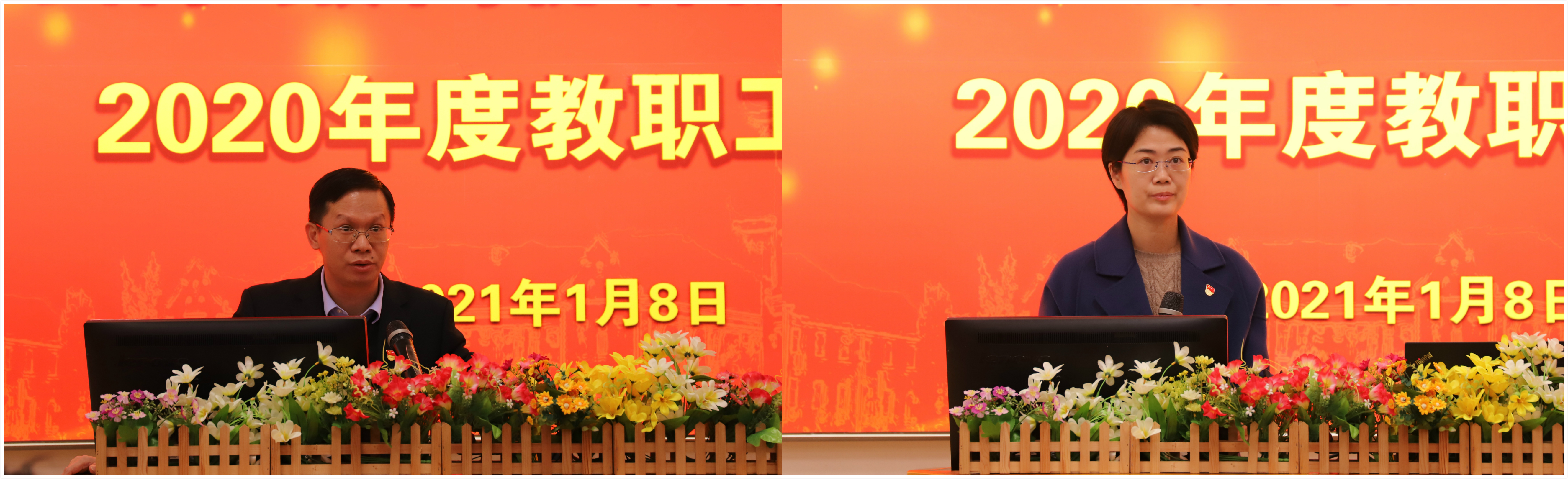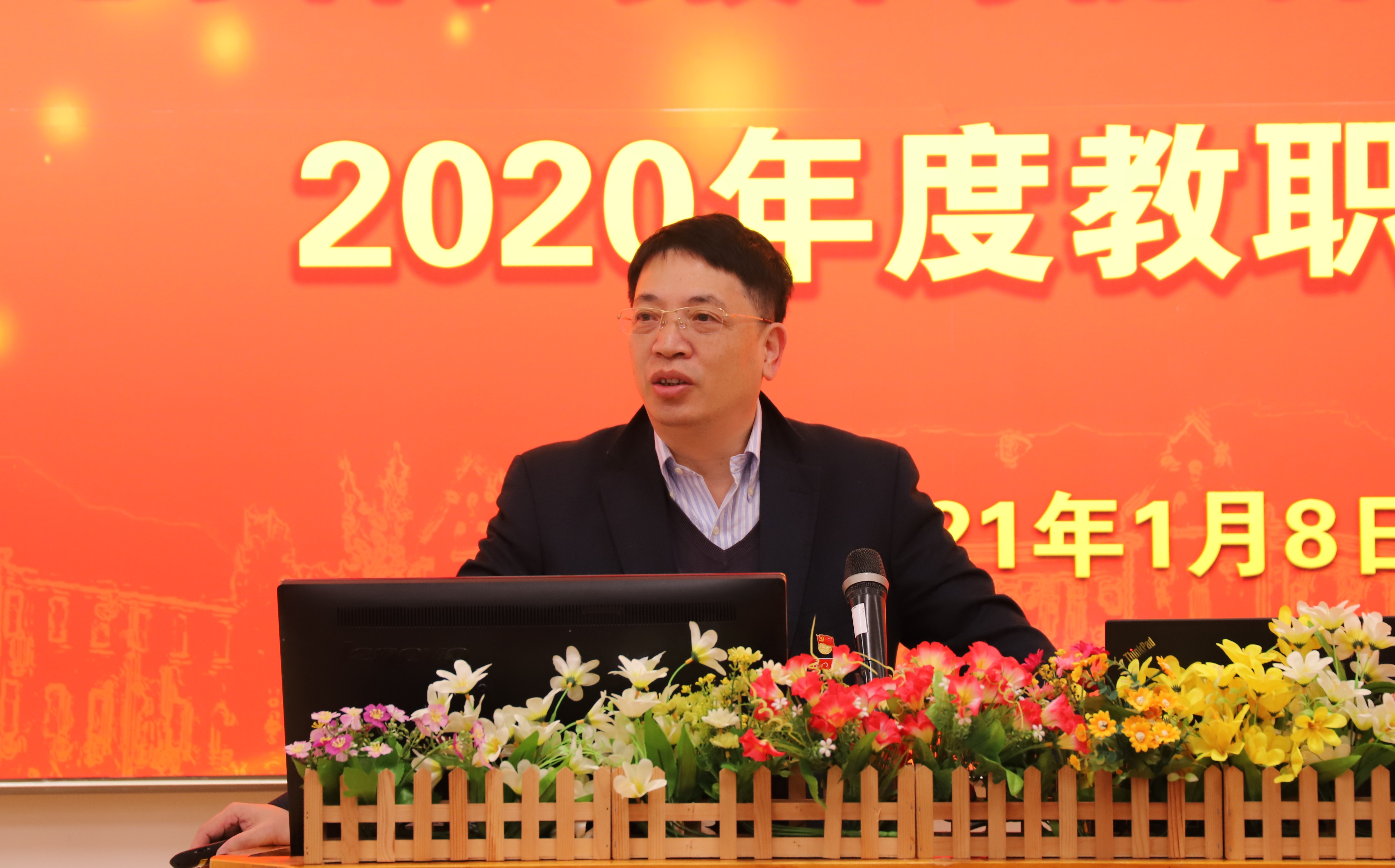 在雄壮的国歌声中,大会拉开了序幕。陈忠院长作了题为“凝心聚力促发展,聚光出彩争一流”的报告,聚焦“党建引领、人才培养、师资引培、科技创新、平台建设、对外合作”六大方面,全面总结了学院2020年的工作,并提出了2021年的工作计划。他希望全院教职工要像高性能LED一样多发光少发热,要有只争朝夕不负韶华的精气神,凝心聚力争创一流,全力奋进“十四五”。