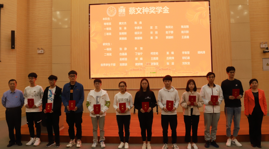 图:施芝元处长、吴国瑛书记为获得蔡文种奖学金的学生代表颁奖