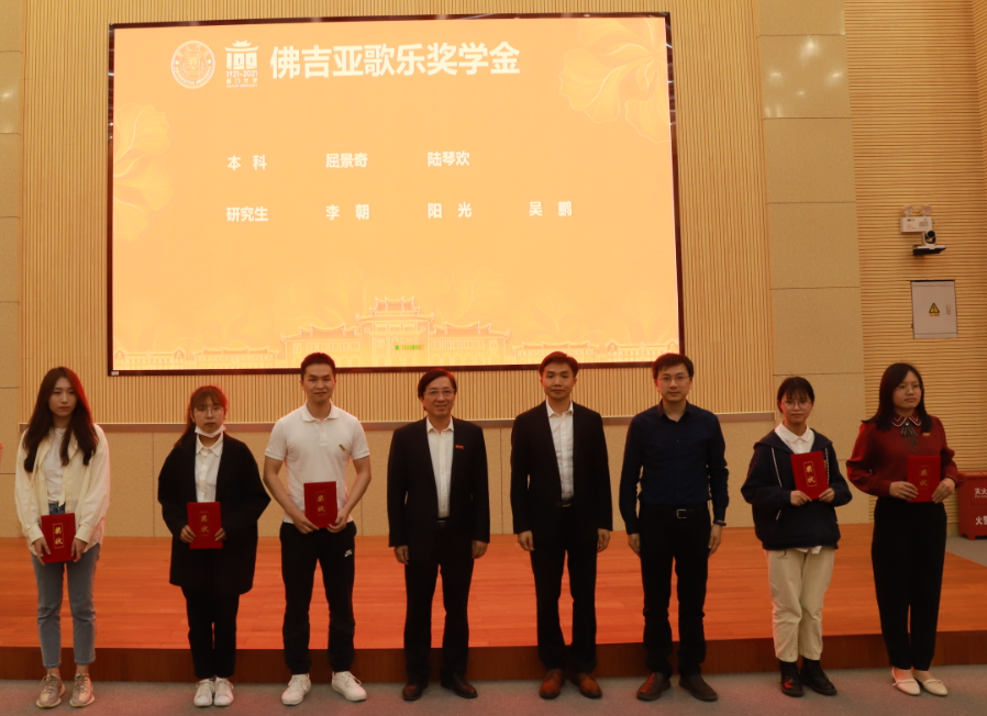 图:佛吉亚歌乐(厦门)总经理何冬、蔡励元副院长、电子工程系副主任陈鹭剑教授为获得佛吉亚歌乐奖学金的学生代表颁奖