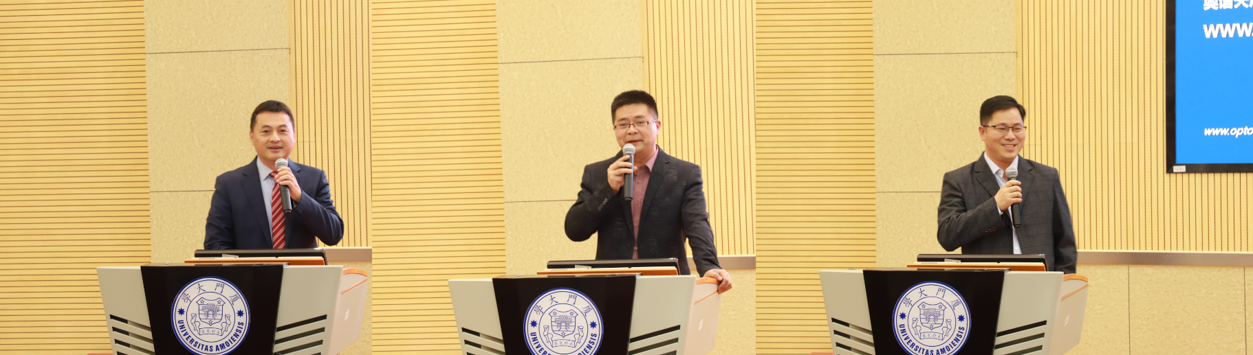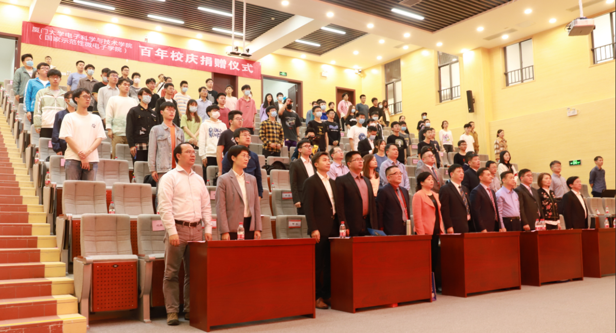 4月5日,厦门大学电子科学与技术学院(国家示范性微电子学院)在翔安校区学武楼B101会议室举行了校友创新创业论坛暨奖助学金颁发仪式。厦门优迅高速芯片有限公司董事长柯炳粦,厦门龙胜达照明电器有限公司董事长李希龙,西昌卫星发射中心西昌指挥控制中心主任刘剑锋,奥谱天成(厦门)光电有限公司总经理刘鸿飞,厦门信和达电子有限公司副总经理朱静,佛吉亚歌乐电子(厦门)总经理何冬,厦门大学实验室与设备管理处处长施芝元,学院党委书记吴国瑛,院长陈忠,学院副院长蔡励元,学院党委副书记郑莉,各系领导负责人,其他企业嘉宾以及学院师生代表约120人参加颁发仪式。学院党委副书记方银水主持仪式,仪式在悠扬的国歌声中拉开了序幕。
