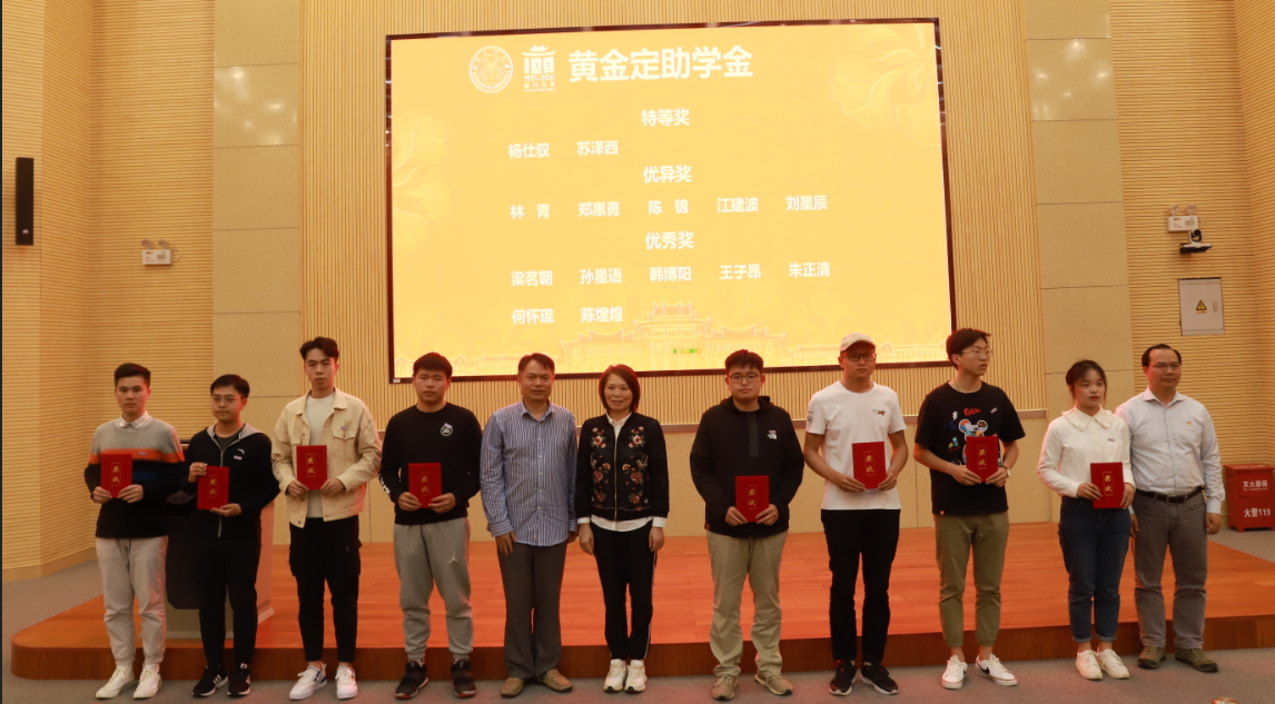 图:信和达朱静副总经理、工会沈桂平主席、微电子系副主任周剑扬教授为获得黄金定助学金的学生代表颁奖