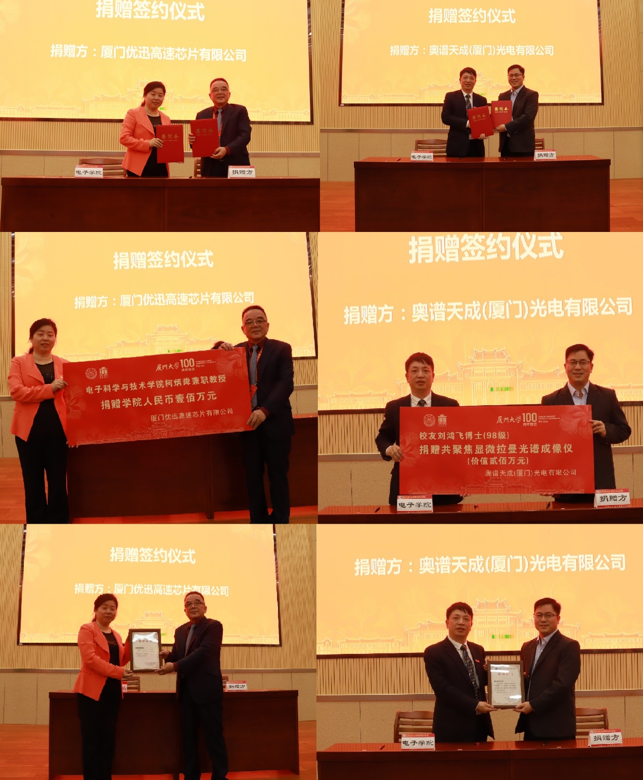 颁发仪式上,厦门优迅高速芯片有限公司董事长柯炳粦校友向学院捐赠100万,奥谱天成(厦门)光电有限公司董事长刘鸿飞校友向学院捐赠200万元仪器一台,吴国瑛书记和陈忠院长代表学院与两位校友签约并颁发了捐赠证书。陈忠院长宣读了获得2020年度学院奖助学金名单,其中蔡文种奖学金35人,黄金定助学金14人,佛吉亚歌乐奖学金5人,刘晓数理奖学金19人和龙胜达奖教金3人。接着,企业代表与学院领导分别为获奖学生颁发了证书。随后,捐赠方代表柯炳粦校友,设奖方代表朱静、何冬校友以及获奖学生杨仕驭、李朝同学进行了发言。