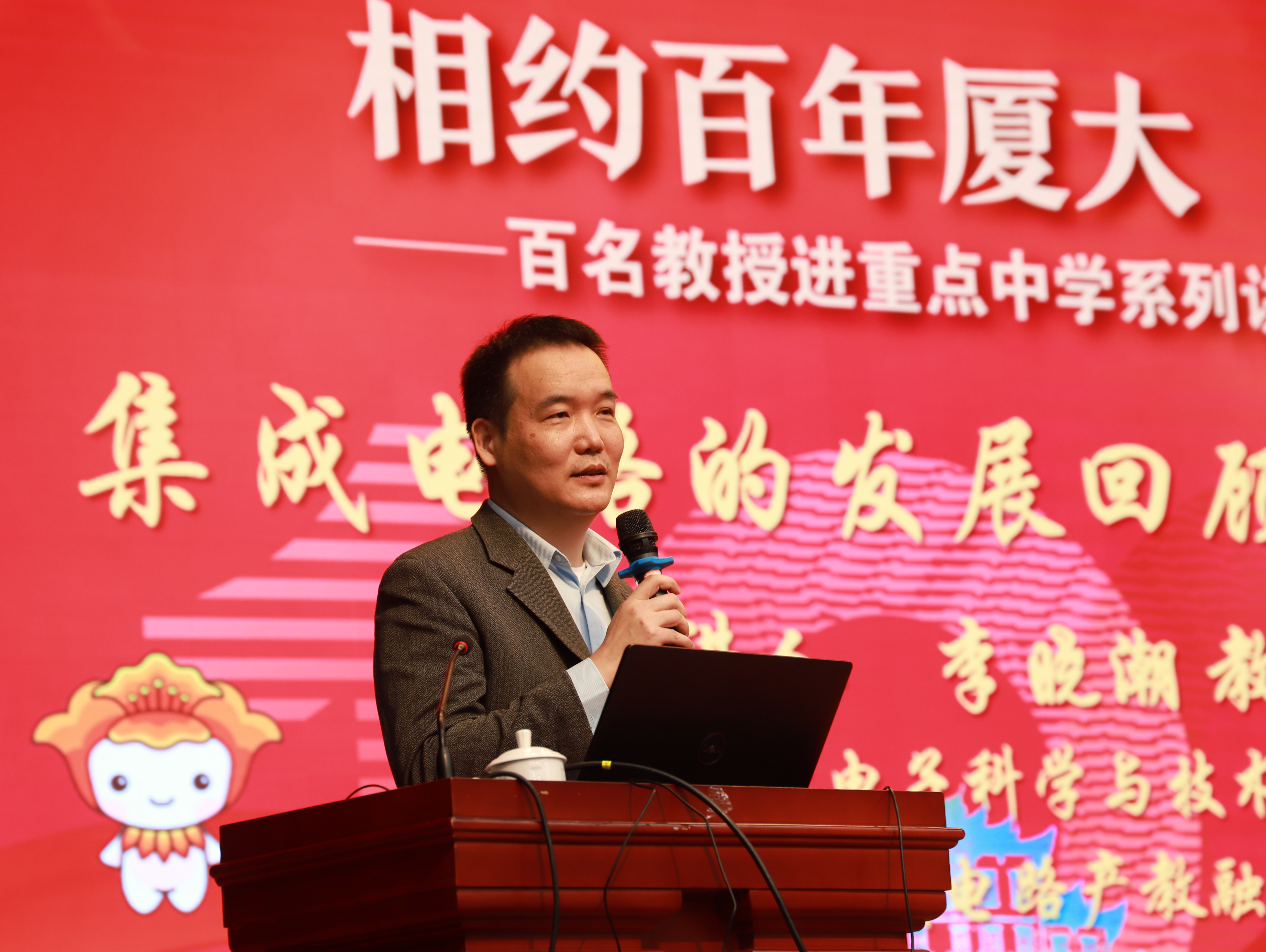 仪式后,李晓潮教授为同学们作了《集成电路的发展回顾与展望》的科普讲座。他系统地介绍了集成电路的发展历程和现状概况,详细地讲解了芯片的制造工艺和难点痛点,带领同学们领略了集成电路的“工艺之美”。在有奖互动环节,他还鼓励同学们读书报国,积极报考集成电路专业。