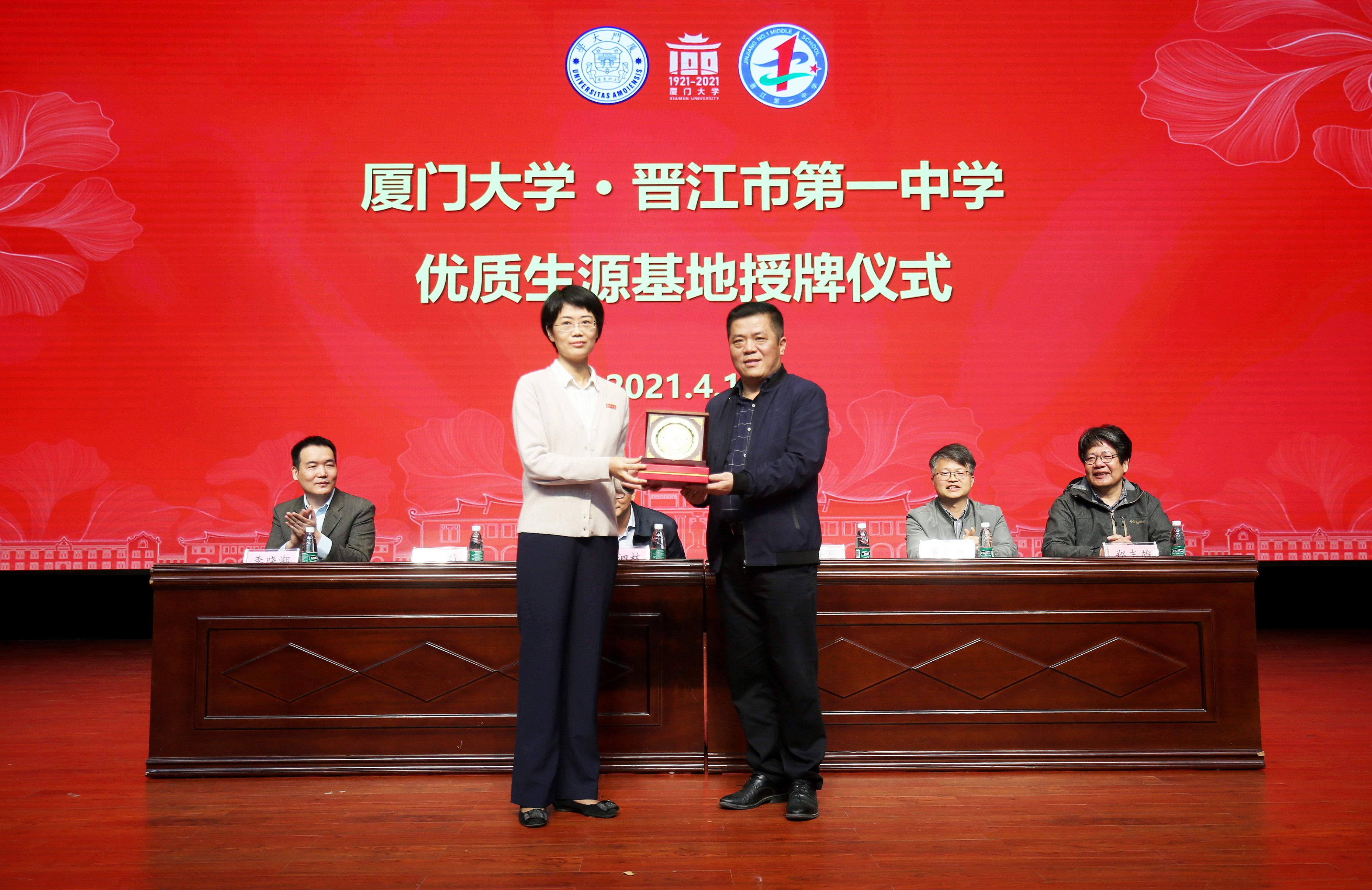 在师生共同的见证下,陈泗林副处长向陈燎原校长授予“厦门大学优质生源基地”牌匾,郑莉副书记向陈燎原校长赠送了厦门大学纪念盘。