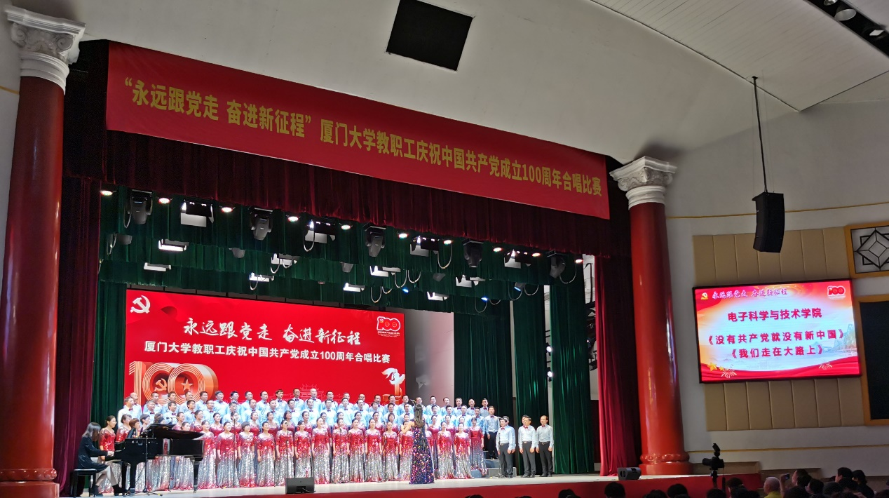 6月26日晚,“永远跟党走 奋进新征程”厦门大学教职工庆祝中国共产党成立100周年合唱比赛在建南大会堂隆重举行。电子科学与技术学院教工合唱团90多名教职员工参与此次比赛。