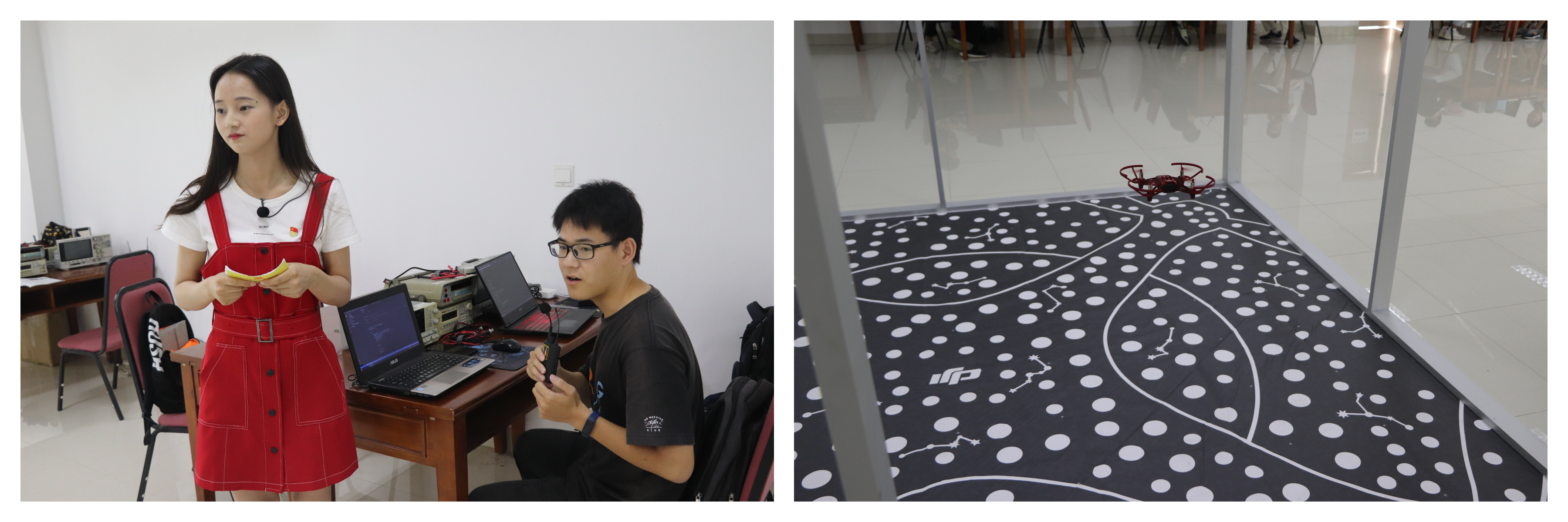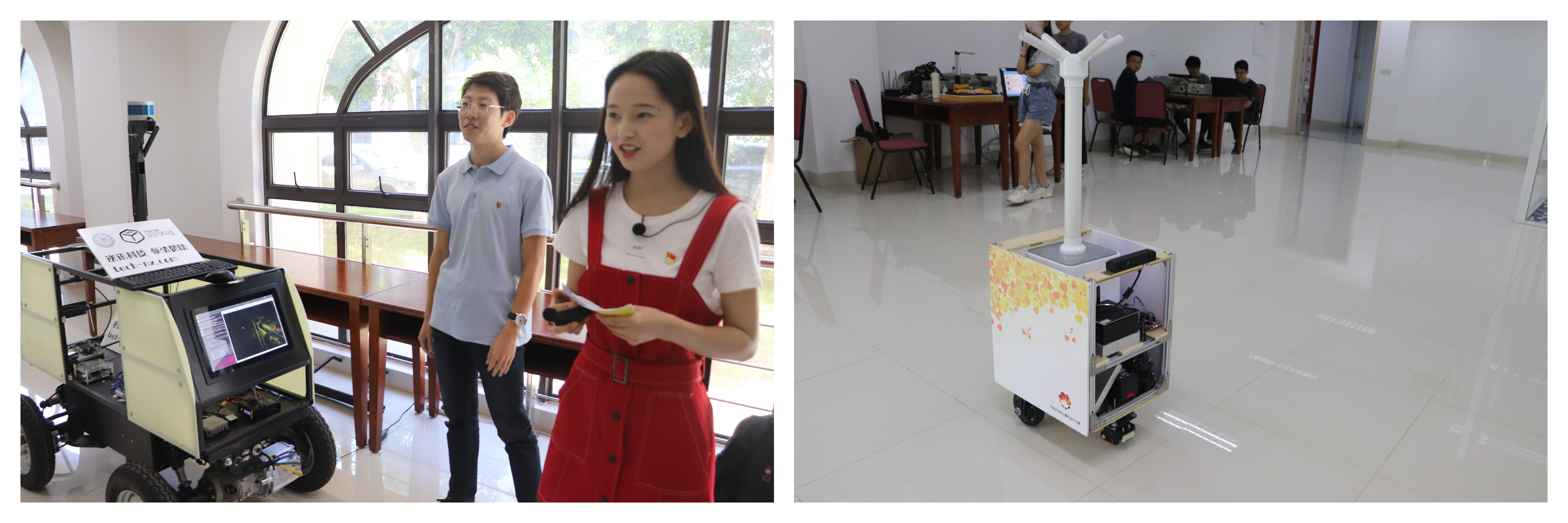 看完“小家伙”,自然少不了“大玩意”。接下来,实验室同学向大家介绍了搭载着国产“龙芯”芯片的自制无人驾驶小车、根据疫情防控需求设计的防疫机器人、自主设计和编程实现的无人机飞行器以及面向新零售的面包贩卖自动结算系统。这些发明创造集科技感和趣味性于一体,使观看直播的未来萌新眼前一亮。