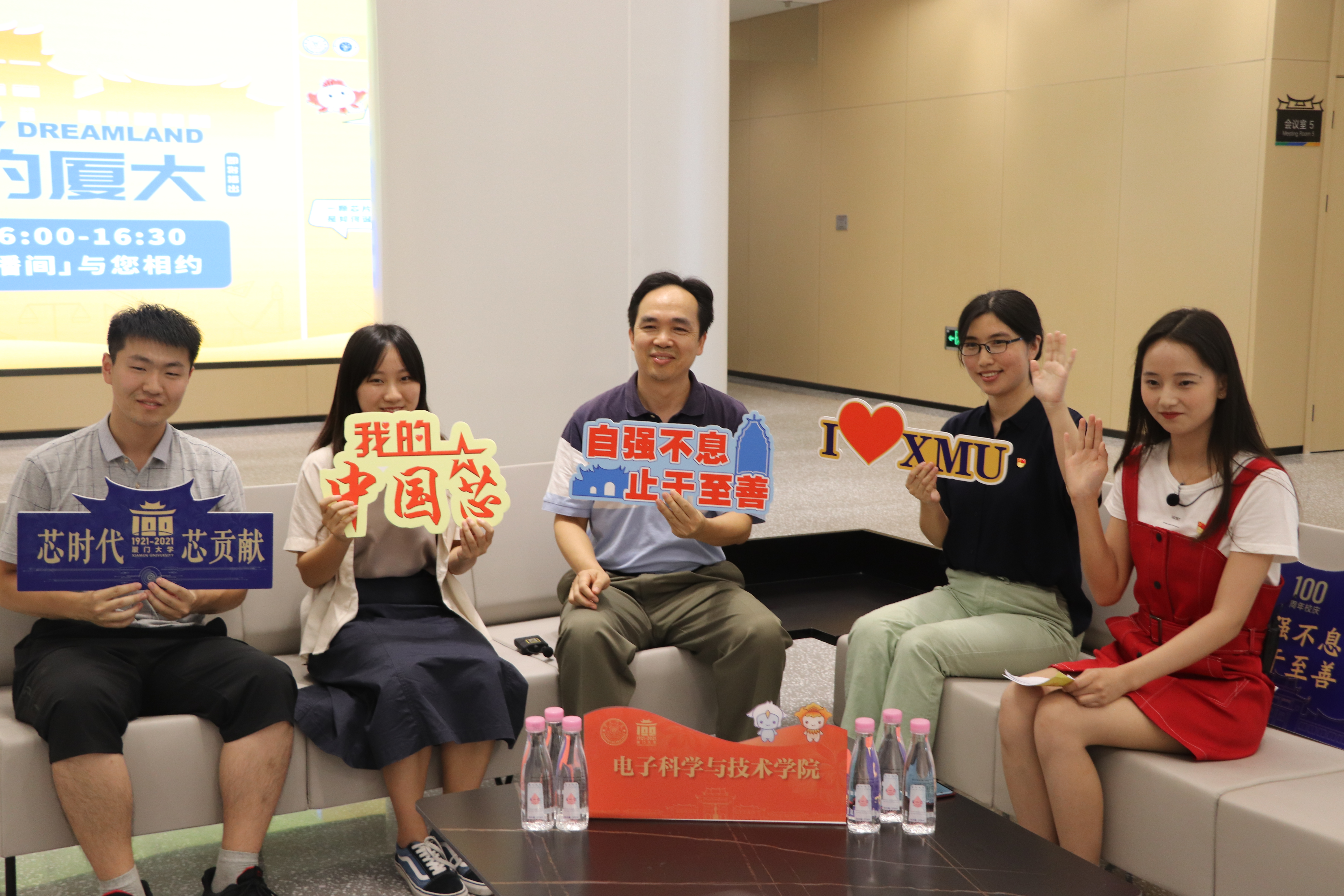 最后,观看直播的朋友们跟随着镜头,来到了嘉庚创新实验室3号楼的会议大厅,并与电子工程系付宏燕老师,团委书记韩海雄老师,2017级本科毕业生张诗翼同学和2018级本科生范帮旭同学展开了交流。学长学姐分享了在学院的学习生活体会,老师们则回应了同学们关心的毕业去向、就业待遇和专业分流等问题,共同为未来的萌新们在线支招。