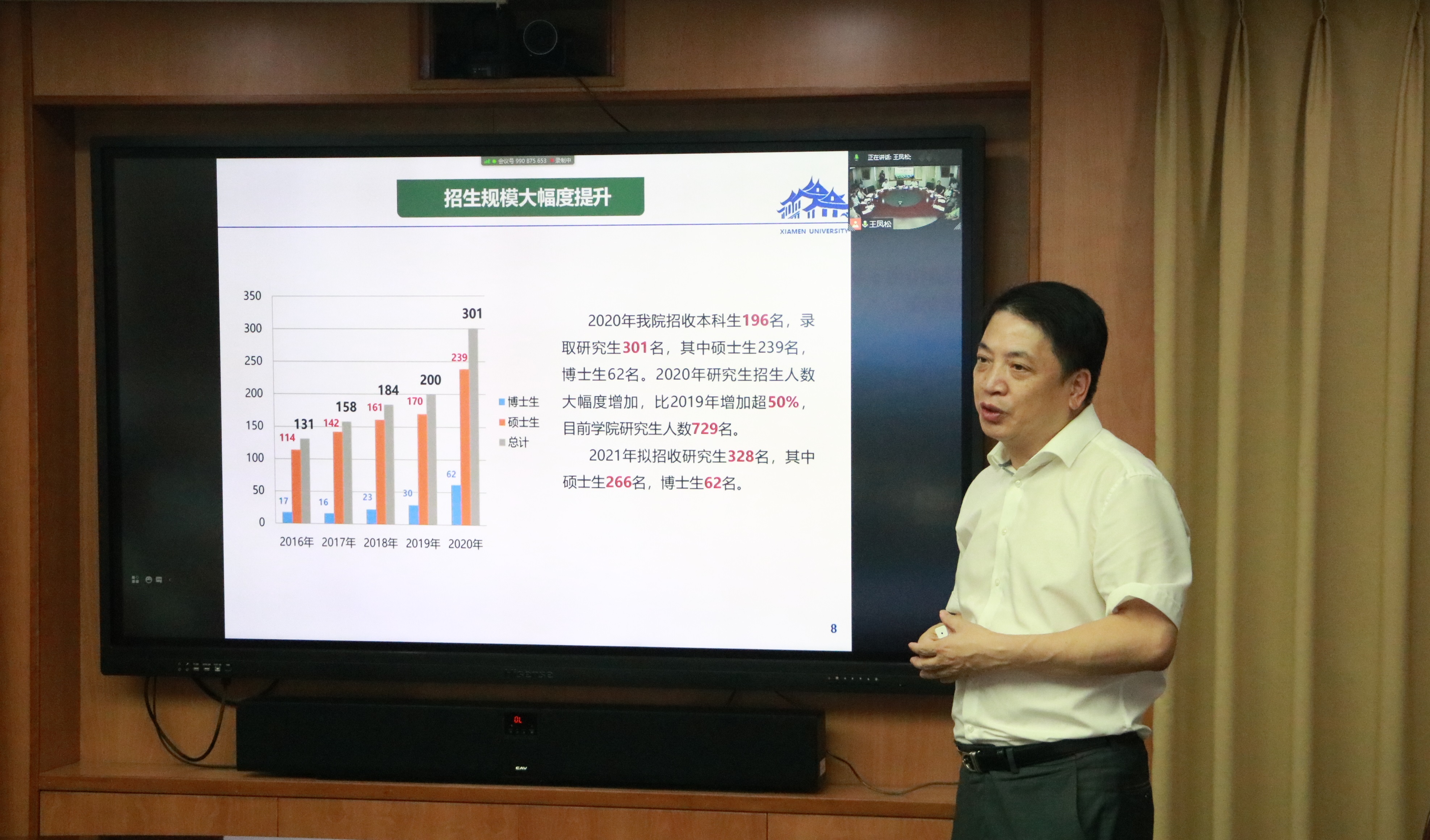 立足学院学科现状和发展目标,陈忠院长作了专题工作汇报。他围绕学科历史与发展现状、学科平台与人才培养、科学研究与社会服务、发展目标与机遇挑战等四个方面,系统汇报了电子科学与技术一级学科建设发展情况,并介绍了交叉门类下集成电路科学与工程一级学科的建设规划。他表示,建设集成电路科学与工程和电子科学与技术一级学科博士点是厦门大学服务国家急需和地方经济社会发展的重要战略布局,学校将尽快办出特色优势,为电子信息尤其是集成电路产业人才培养和技术研发做出更大的贡献!